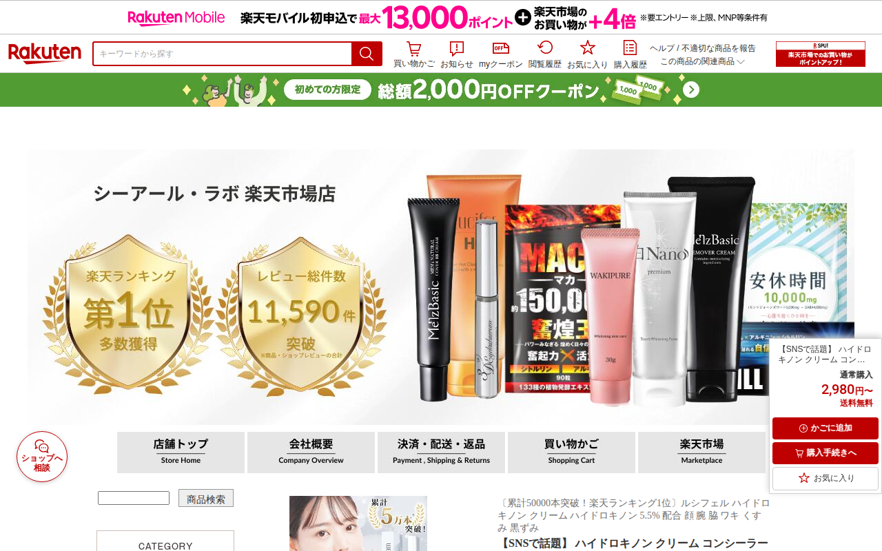 このページは、楽天市場で販売されているハイドロキノンクリーム「ルシフェル」の商品ページです。純度99.9%のハイドロキノン5.5%を配合した15gのフェイスクリームで、価格は2,980円(送料無料)。シミ、そばかす、ニキ...