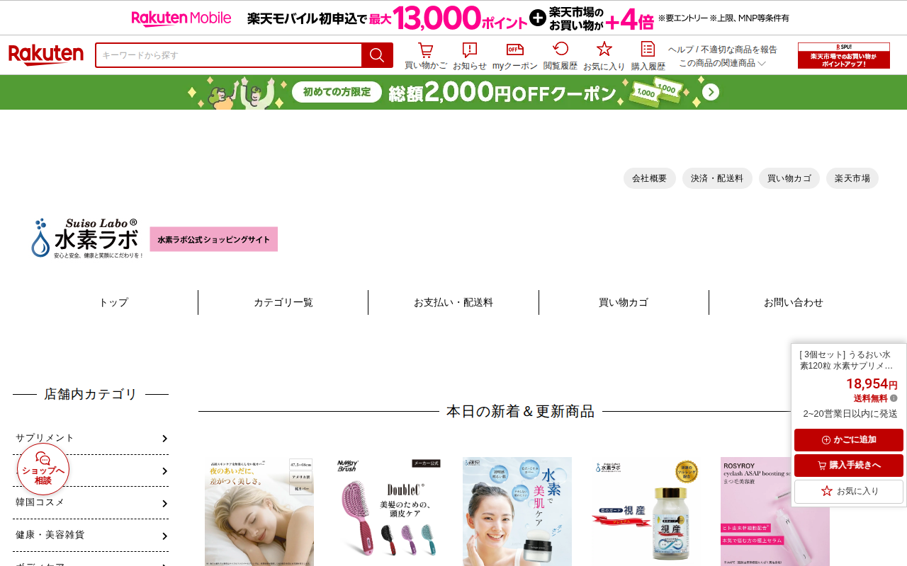 このページは、楽天市場で販売されている高濃度水素イオン液「すいそすい」の商品ページです。250ppm、300cc入りで価格は11,660円、送料無料。小笠原列島沖採水で、人間だけでなくペットの犬や猫にも飲用可能とされてい...