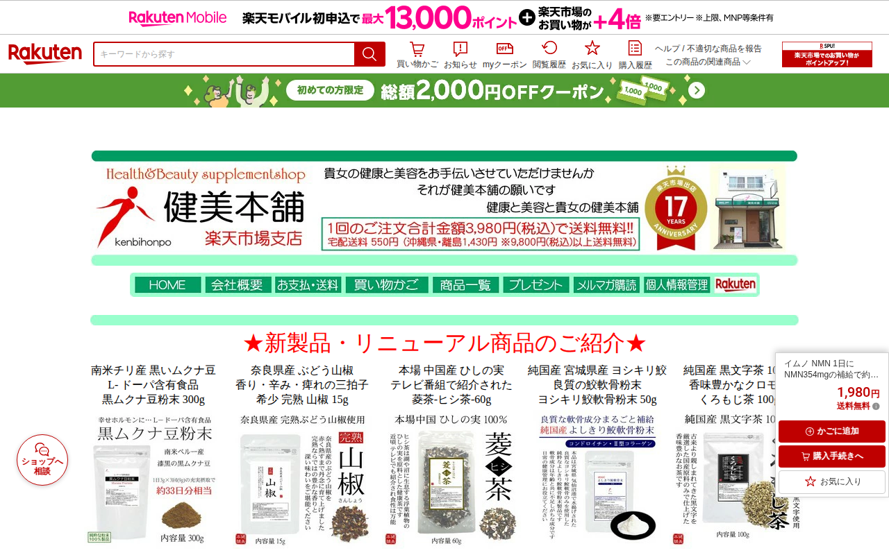 このページは、楽天市場の健美本舗で販売されているNMNサプリメント「イムノ NMN」の商品ページです。1日1カプセル(NMN354mg)で約30日分、合計NMN10,639mg含有の日本製サプリメントが1,980円で販売...