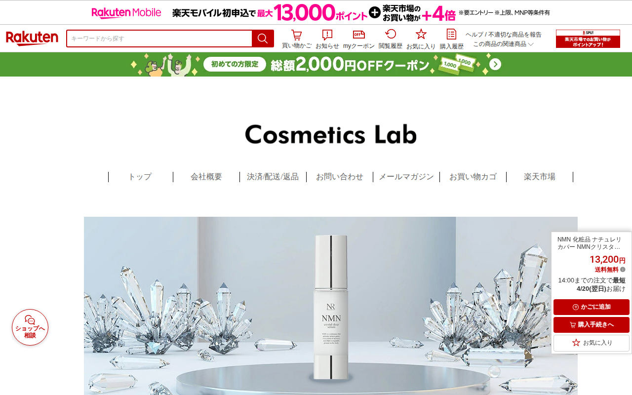 このページは、楽天市場で販売されているNMN配合美容液「ナチュレリカバー NMNクリスタルディープセラム」の商品ページです。内容量30mlで、価格は13,200円(送料無料)。NMN(ニコチンアミドモノヌクレオチド)やヒ...