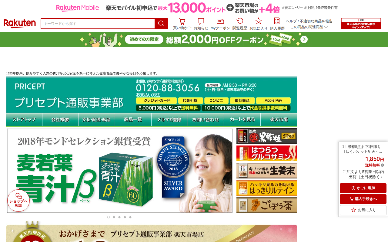 このページは、楽天市場で販売されているNMN Re:AGEサプリメントの商品ページです。1世帯5点まで1回限りのお試し特別価格で1,850円(送料無料)で提供されています。60粒30日分で、高純度99%以上のNMN300...