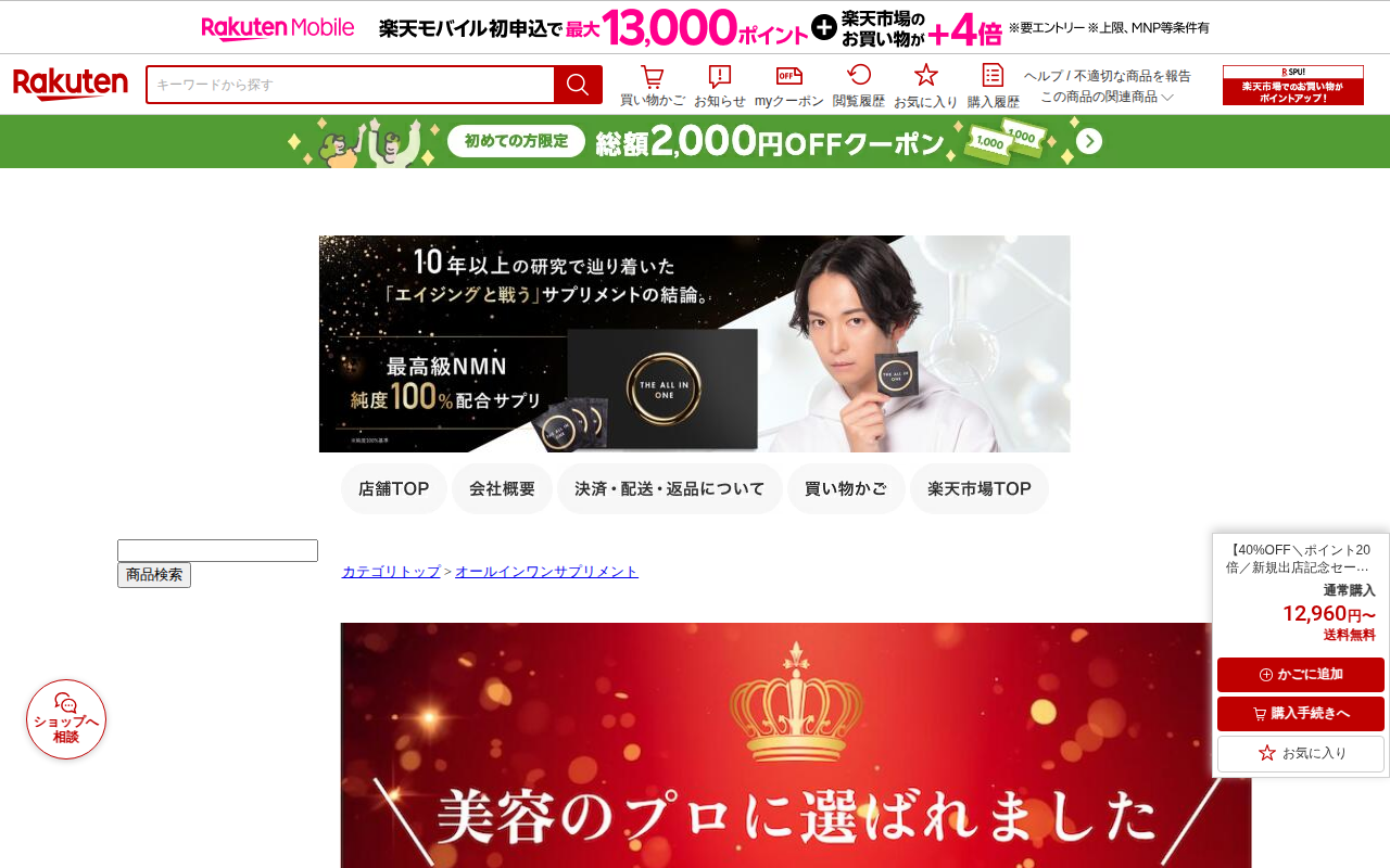 このページは、楽天市場で販売されている「THEオールインワン」というNMNサプリメントの商品紹介ページです。美容皮膚科医監修で開発された、NMN15000mg配合の高級サプリメントで、新規出店記念としてポイント20倍キャ...