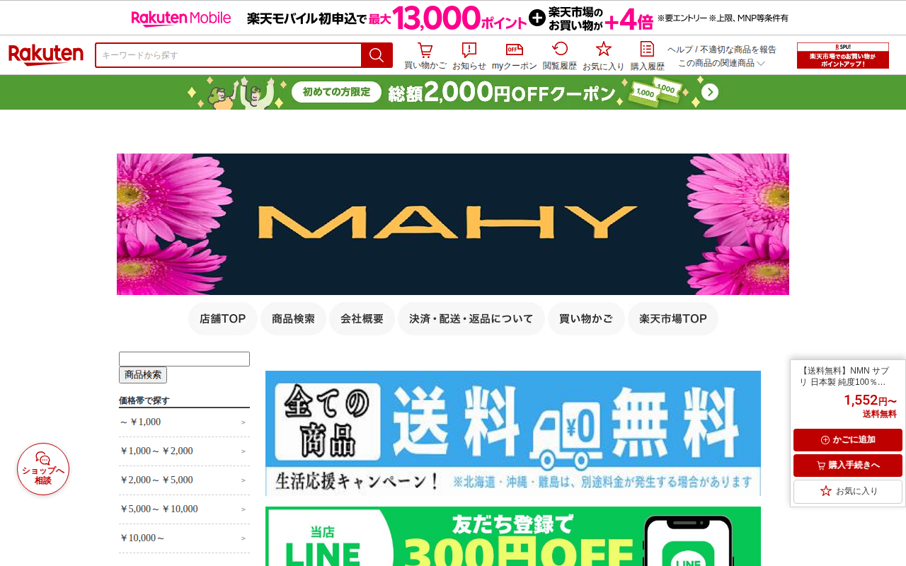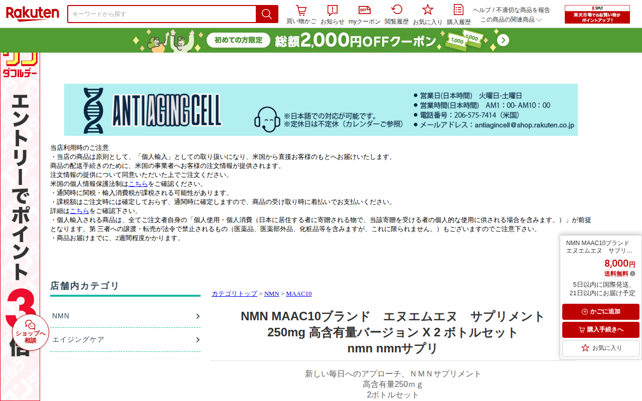 このページは、楽天市場で販売されているNMN MAAC10ブランドのサプリメント商品の紹介ページです。1ボトルあたり250mgの高含有量NMNを2ボトルセットで8,000円で販売しています。NMNはNAD+レベルを高める...