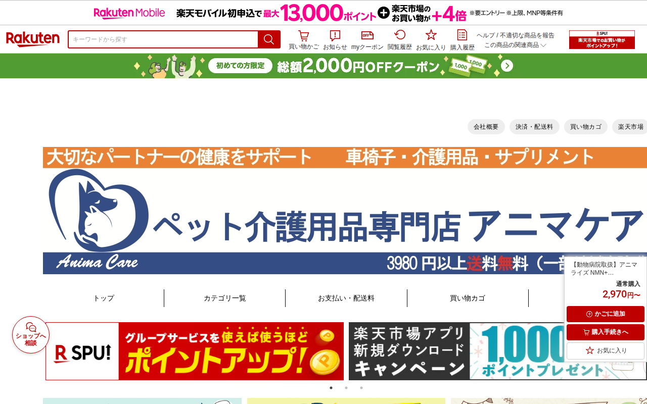 このページは、楽天市場で販売されているペット用NMNサプリメント「アニマライズ NMN+」の商品ページです。犬と猫のシニアライフをサポートするサプリで、MICRONMN(純度99%以上、6,600mg/60g配合)、国産...