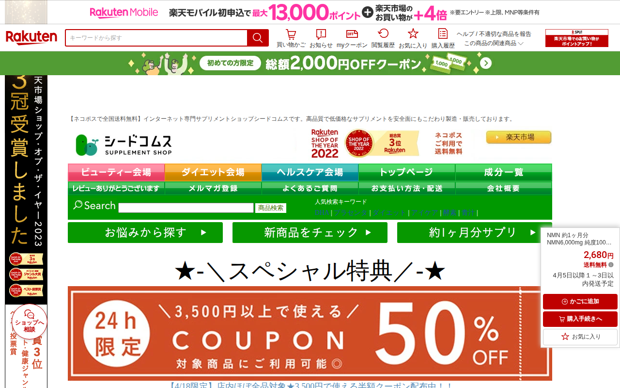 このページは、楽天市場で販売されているNMNサプリメントの商品紹介ページです。シードコムスが販売する国内製造の高品質NMN製品で、1ヶ月分30カプセル入り、NMN6,000mg配合、純度100%です。価格は2,680円で...