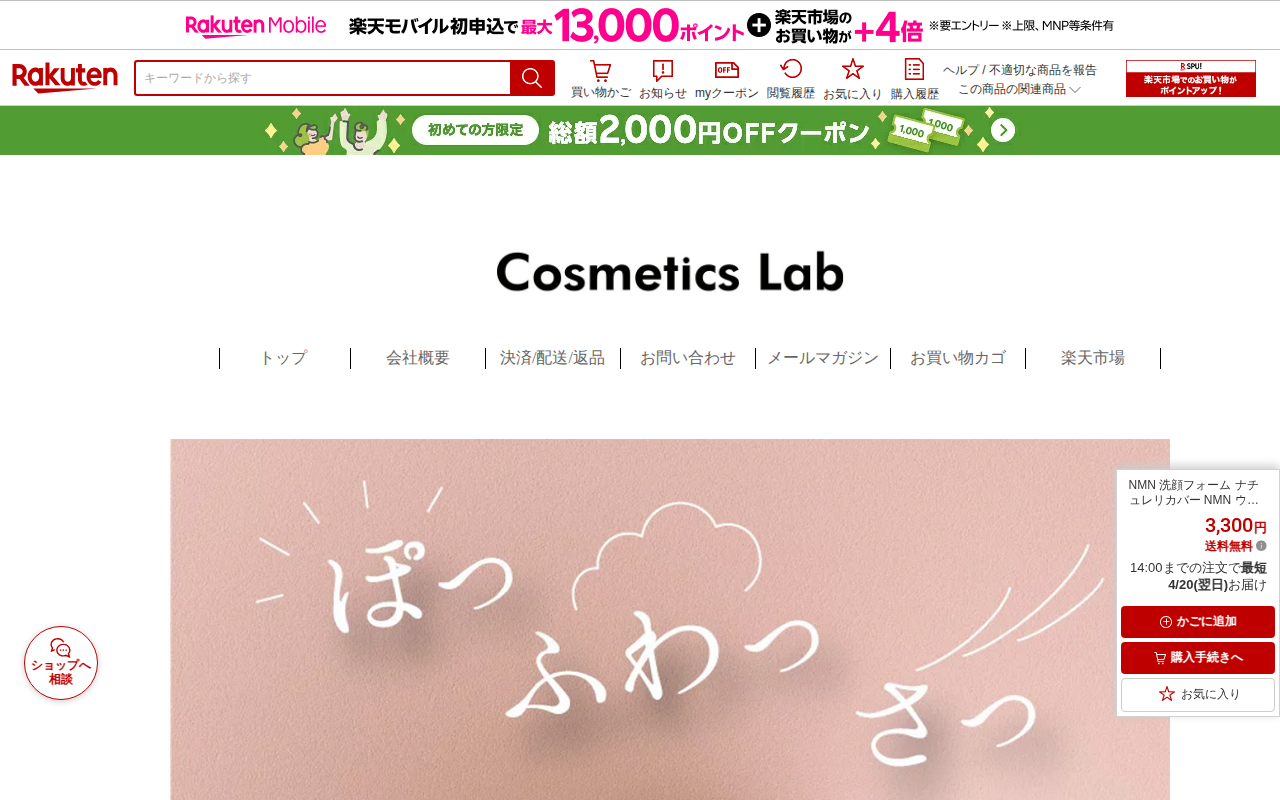 このページは、楽天市場で販売されているNMN配合の洗顔フォーム「ナチュレリカバー NMN ウォームピールウォッシュ」の商品ページです。120g入りで3,300円(送料無料)。ヒト幹細胞培養液、セラミド、ヒアルロン酸、アミ...