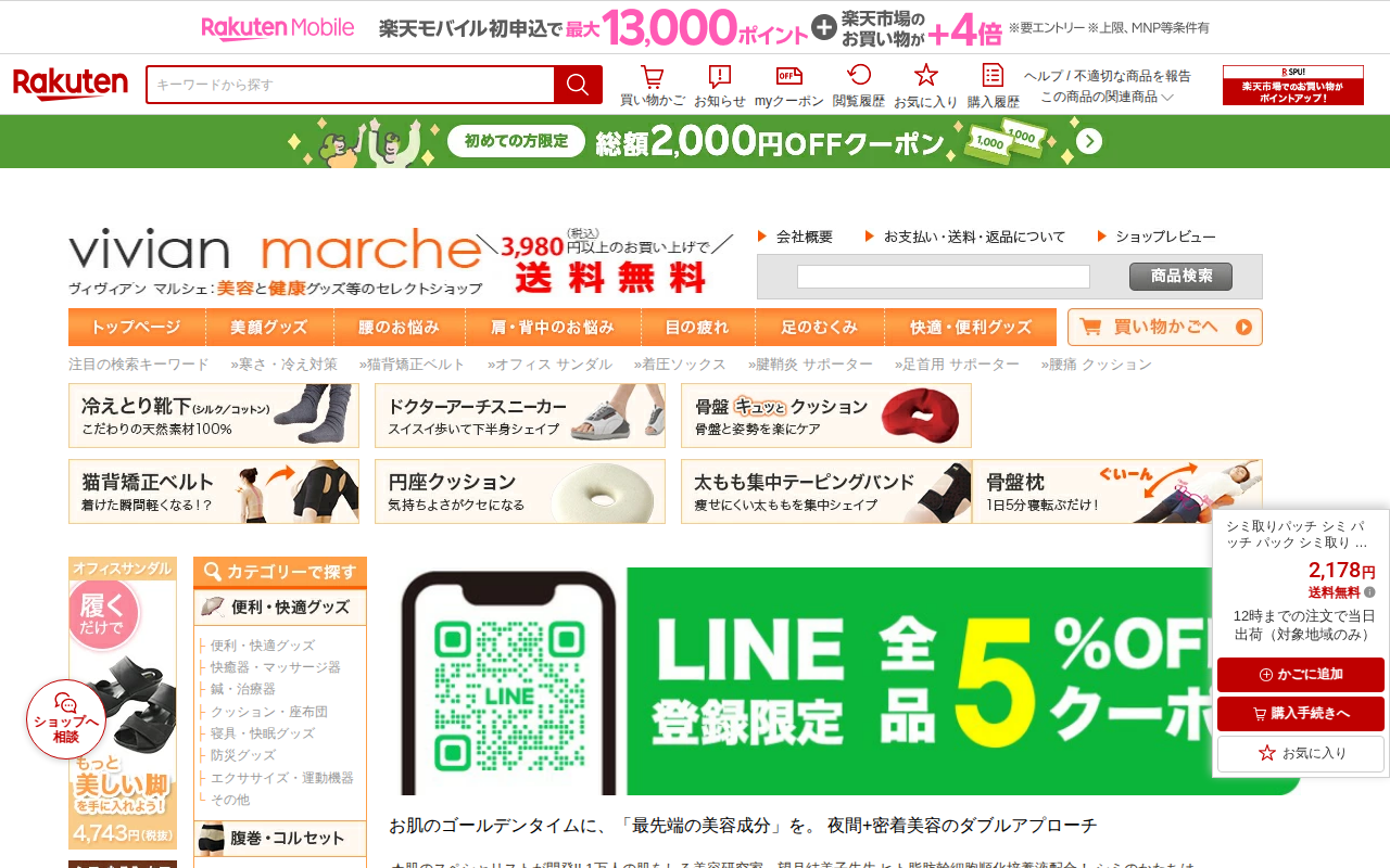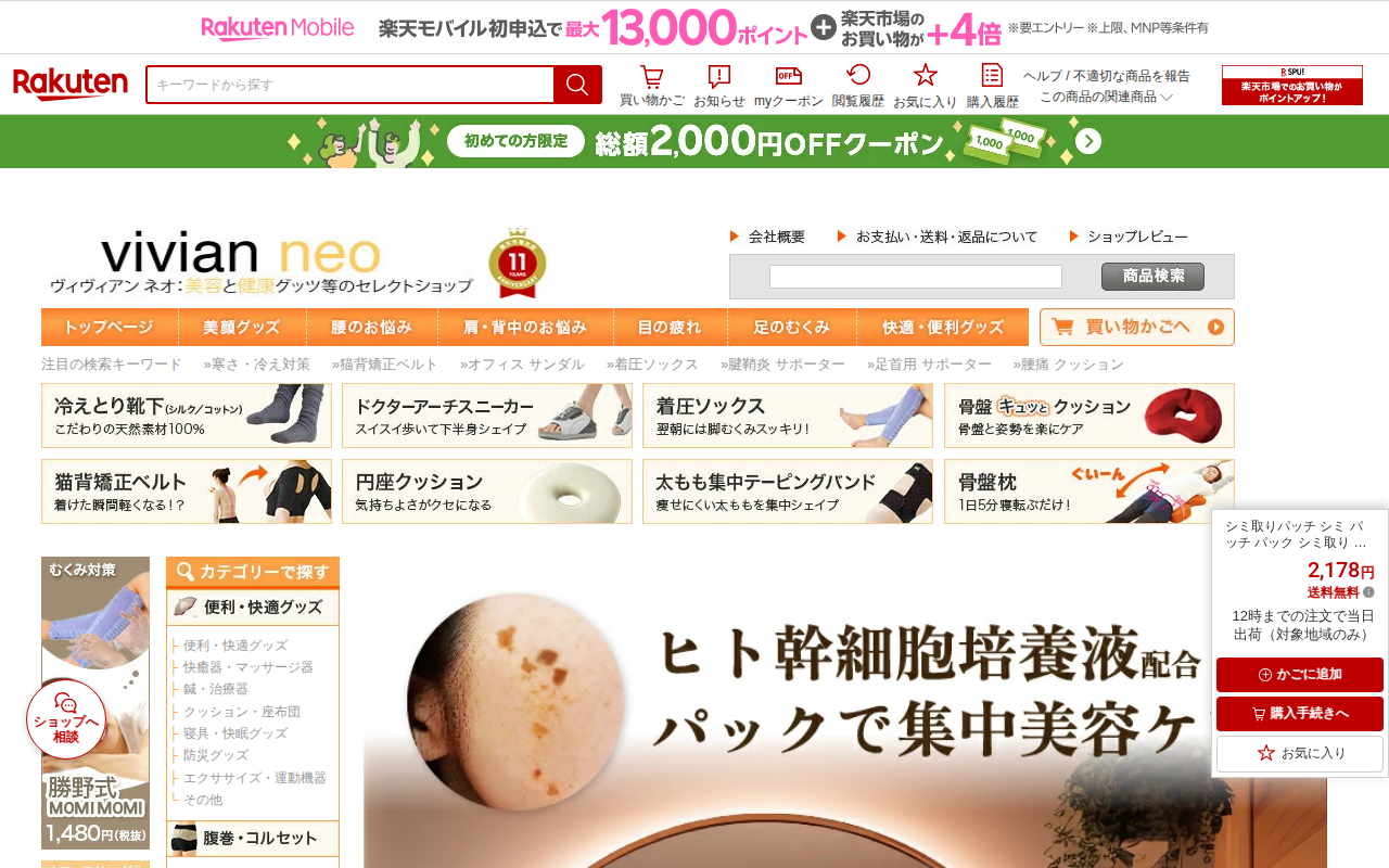 このページは、楽天市場で販売されている「美女ナイトパッチプレミアム」というシミ取りパッチ商品の紹介ページである。価格は2,178円で送料無料、12時までの注文で対象地域は当日出荷が可能。ヒト脂肪幹細胞順化培養液を配合し、...