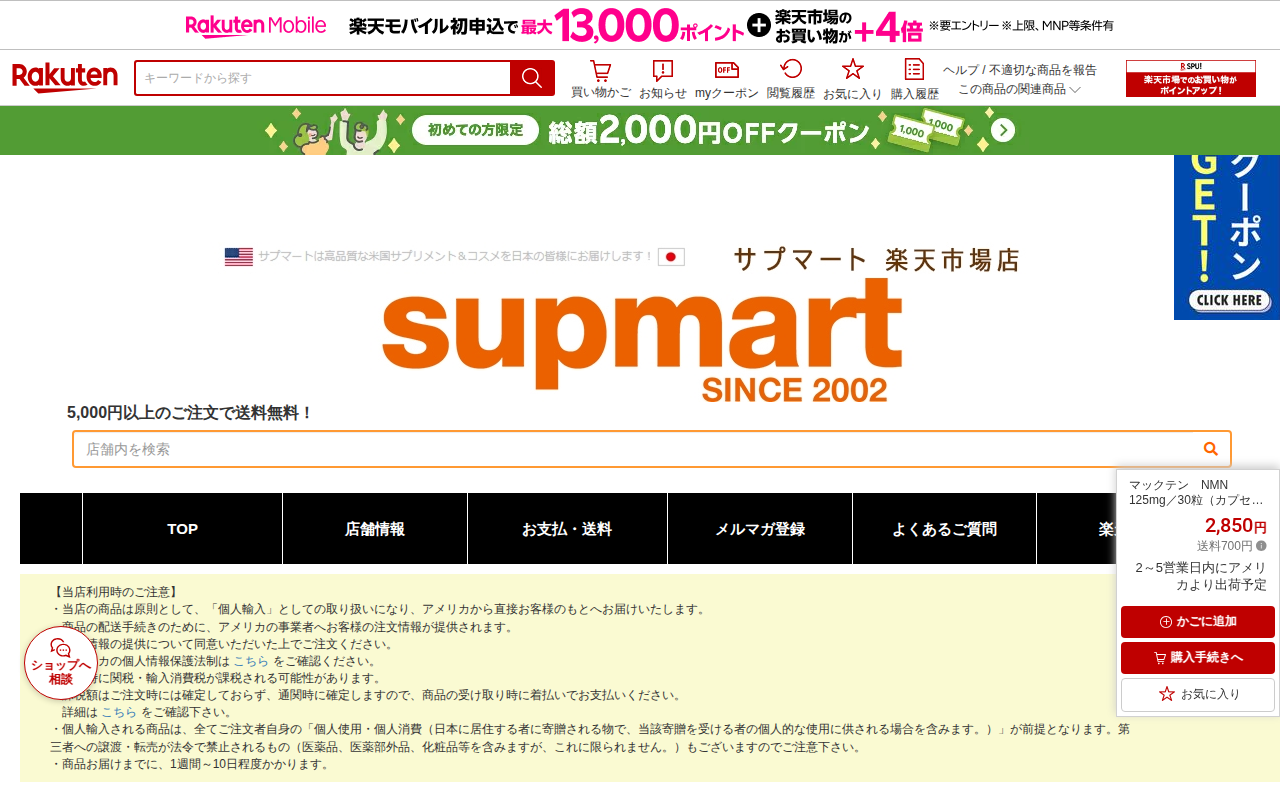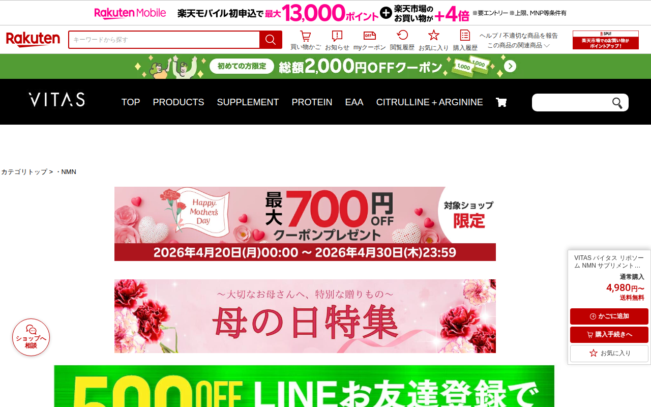 このページは、楽天市場で販売されている日本製NMNサプリメントの商品紹介ページです。NMN4800という製品で、価格は2,640円、送料無料です。NMNはニコチンアミドモノヌクレオチドという成分で、体内でNAD+に変換さ...