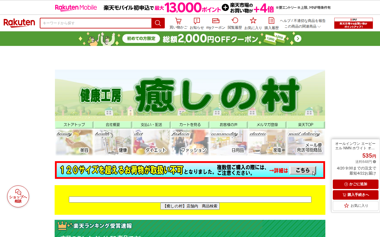 このページは、楽天市場の「癒しの村」店舗で販売されているオールインワンゲル商品の紹介ページです。NMN(ナイアシンアミド)配合のABL NMNホワイトオールインワンゲル245gで、化粧水・美容液・乳液・クリーム・パック・...