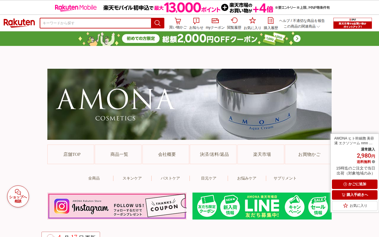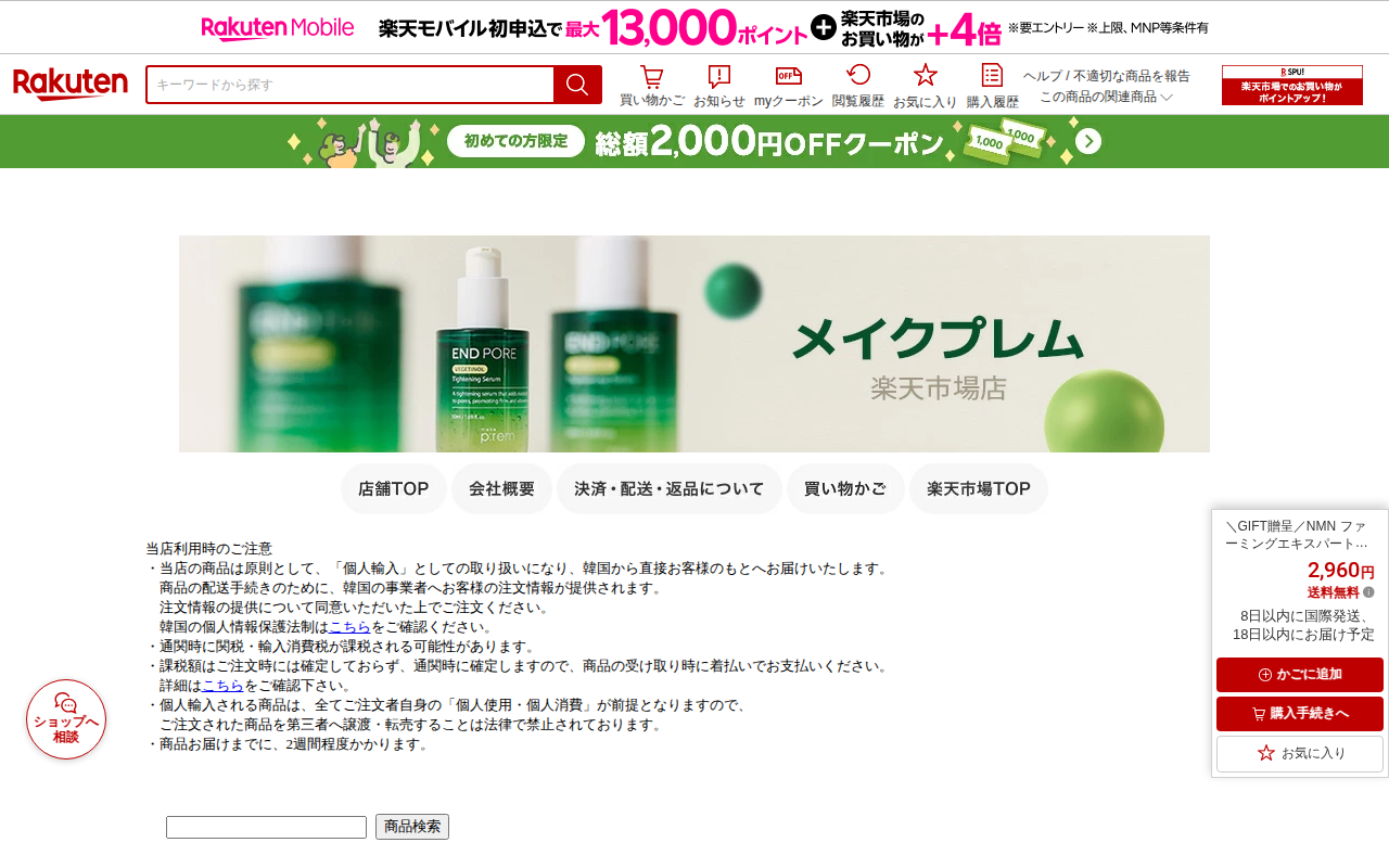 このページはmake p:remの韓国コスメ「NMNファーミングエキスパートアンプル30ml」を紹介する楽天市場の商品ページです。NMN10,000ppm配合の美容液で、失われたハリへの次世代エイジングケアを提供します。...