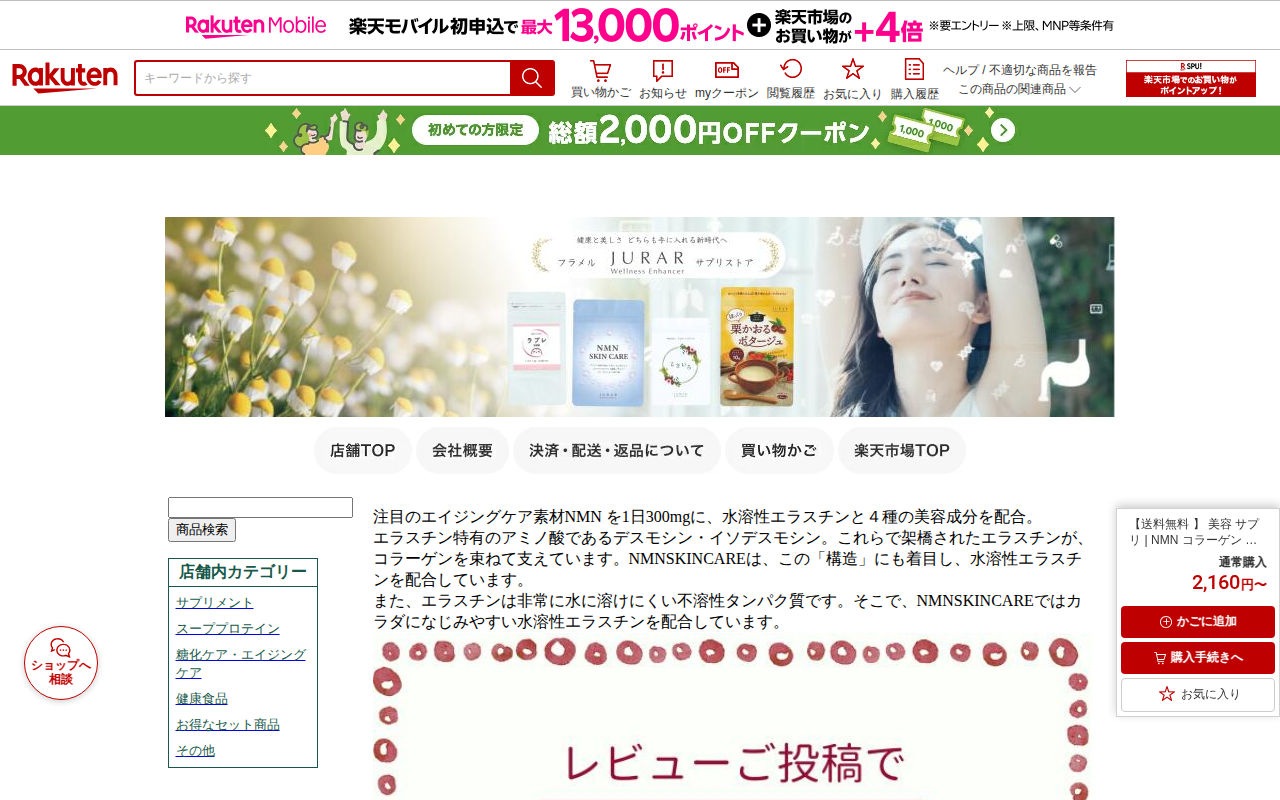 このページは、楽天市場で販売されている美容サプリ「NMN SKINCARE」の商品ページです。NMN 300mgを配合し、水溶性エラスチン、コラーゲン、ヒアルロン酸、リポソームビタミンC、レスベラトロールなど5種の美容成...