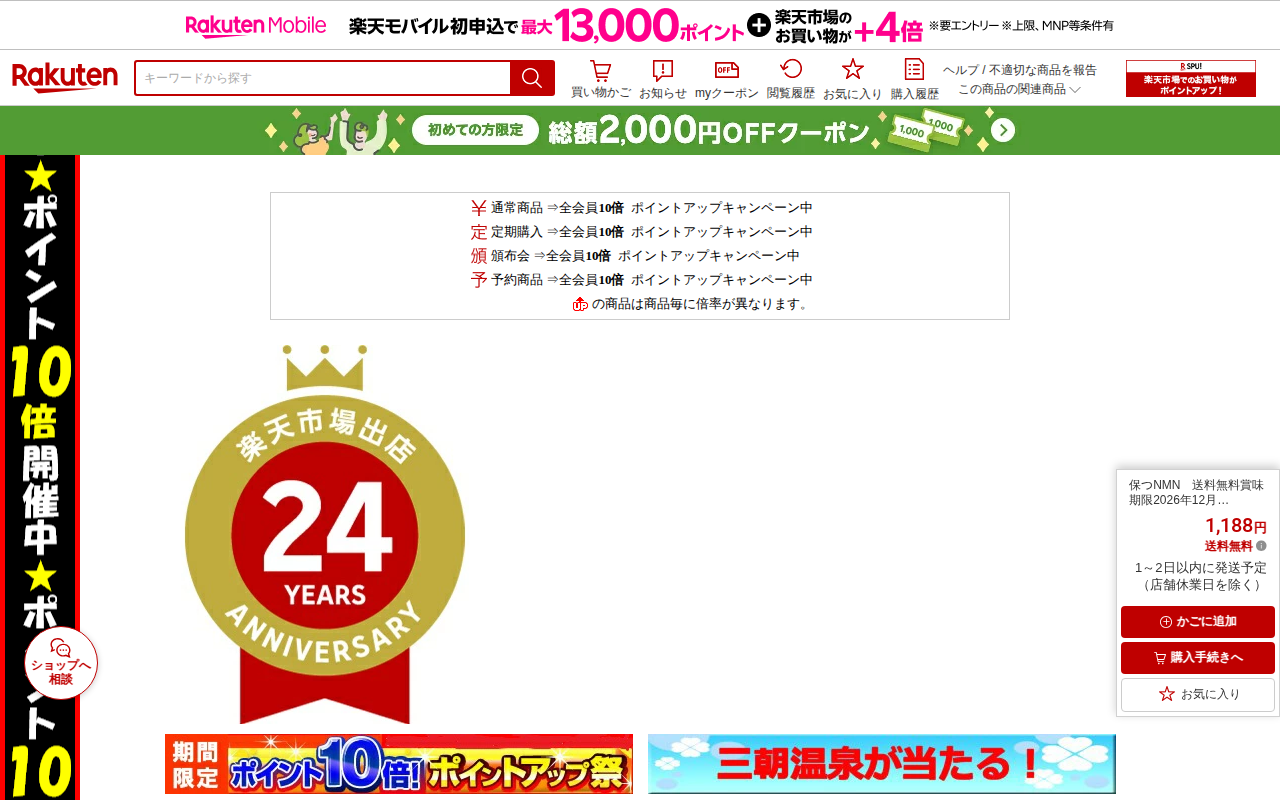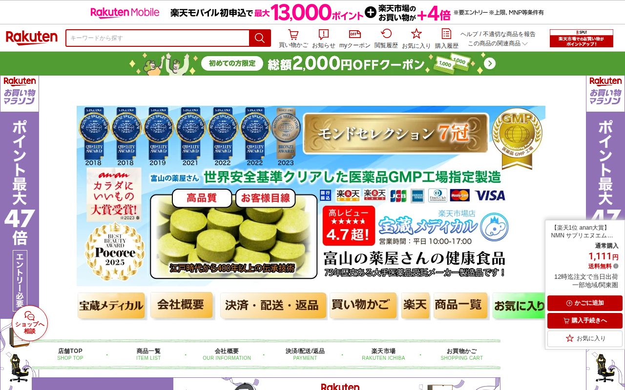 このページは、楽天市場で販売されているNMNサプリメント商品の紹介ページです。宝蔵メディカルによる日本製のニコチンアミドモノヌクレオチド10000mg配合サプリで、楽天1位・anan大賞受賞製品です。腸溶解耐熱性カプセル...