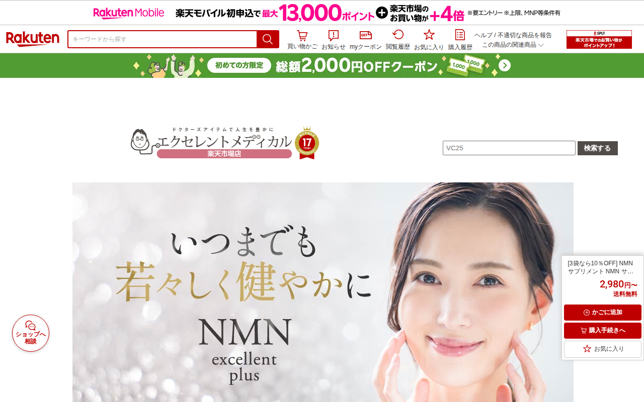 このページは、楽天市場で販売されているNMNサプリメントの商品紹介ページです。美容皮膚科医監修、楽天1位の高純度99%以上のNMN18000mg配合サプリで、日本製です。腸まで届く耐酸性カプセル採用により、高純度のまま吸...