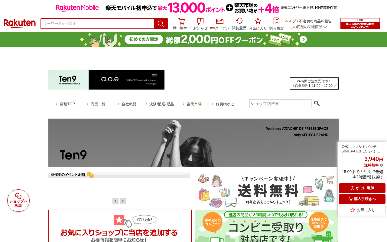このページは、楽天市場で販売されているa.o.e公式のシミパッチ商品の紹介ページです。高濃度ビタミンC配合の植物性シートで、シミやニキビ跡に貼って集中ケアする製品です。30枚入り3,940円で送料無料。洗顔後のスキンケア...