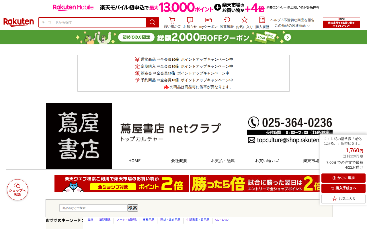 このページは、楽天市場で販売されている書籍の商品ページです。タイトルは「21世紀の新常識『老化は治る。』新型ビタミンが世界を救う!!」で、NMNを上回る老化克服成分「5デアザフラビン(TND1128)」について紹介する医...