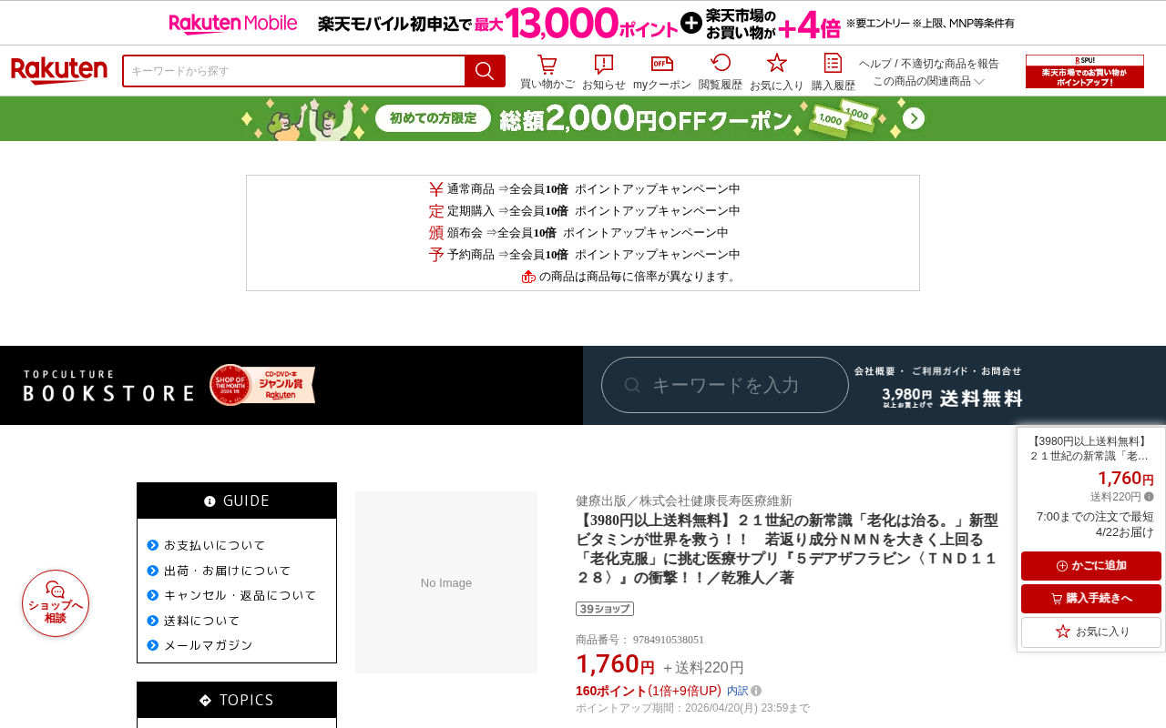 このページは、楽天市場で販売されている書籍の商品ページです。著者・乾雅人による「21世紀の新常識『老化は治る。』新型ビタミンが世界を救う!!」というタイトルの本で、新しい老化克服成分「5デアザフラビン〈TND1128〉」...