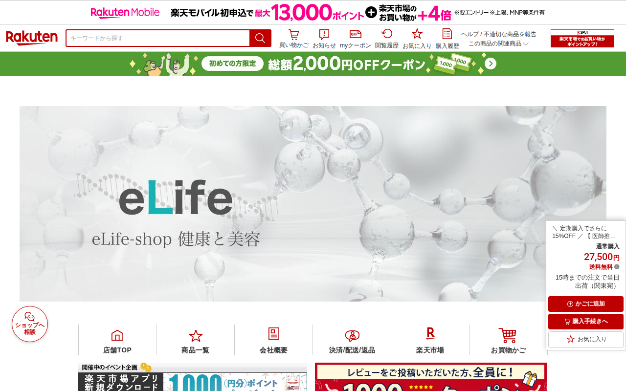 このページは、楽天市場で販売されているeLifeブランドのNMNサプリメント商品の紹介ページです。1粒250mg、30日分のNMN30000mgを含有した日本製サプリで、純度99.9%以上、GMP認定工場製造、第三者機関...