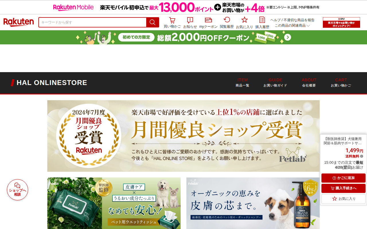 このページは、楽天市場で販売されている犬猫兼用の関節・筋肉サポートサプリメント商品です。獣医師監修で、厚生労働省認定工場で製造されています。価格は1,499円で送料無料、90粒1ヶ月分です。プロテオグリカン・コンドロイチ...