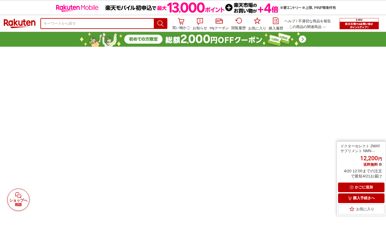 このページは、楽天市場で販売されているドクターセレクト「2WAYサプリメント NMN 9000N プラス」の商品ページです。60粒入り、12,200円(送料無料)のサロン専売品で、飲むと塗るの2つの使用方法に対応していま...