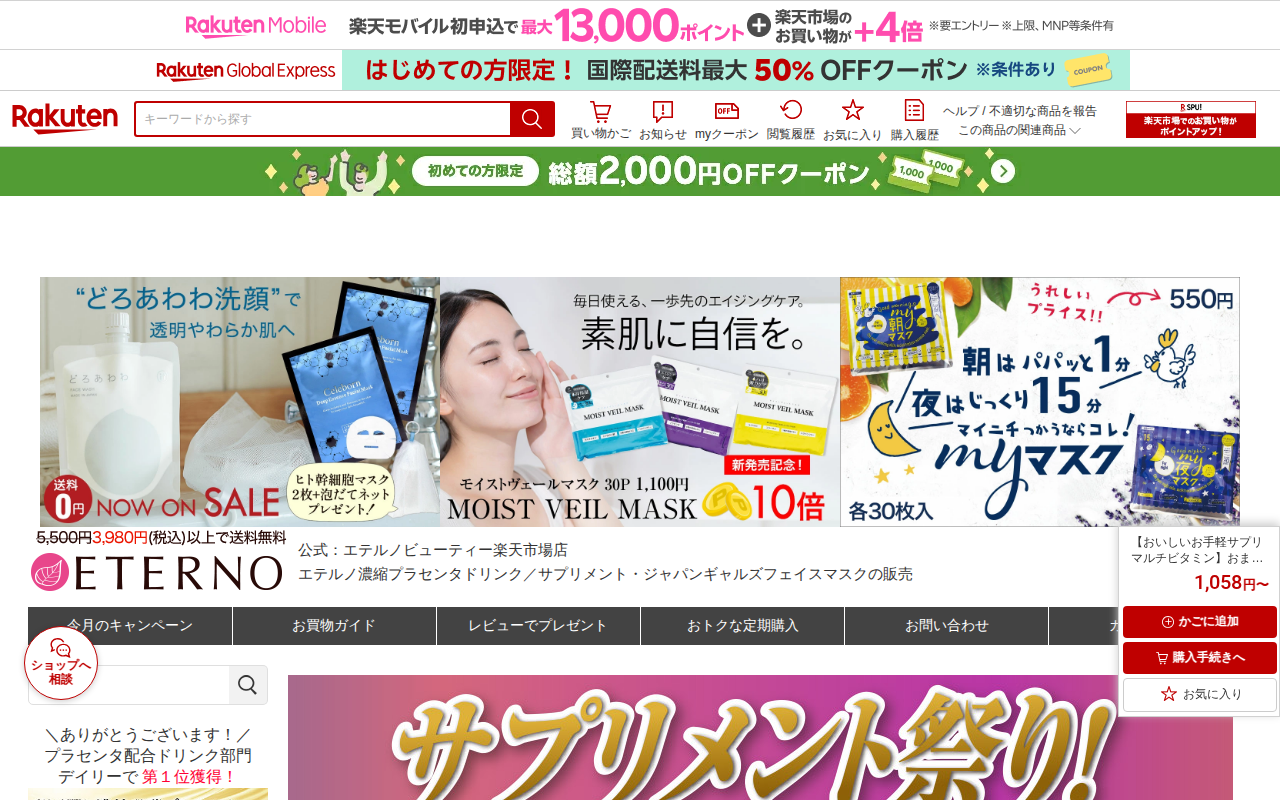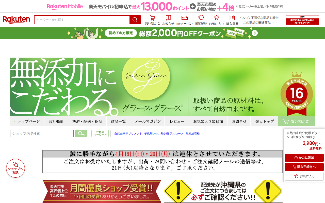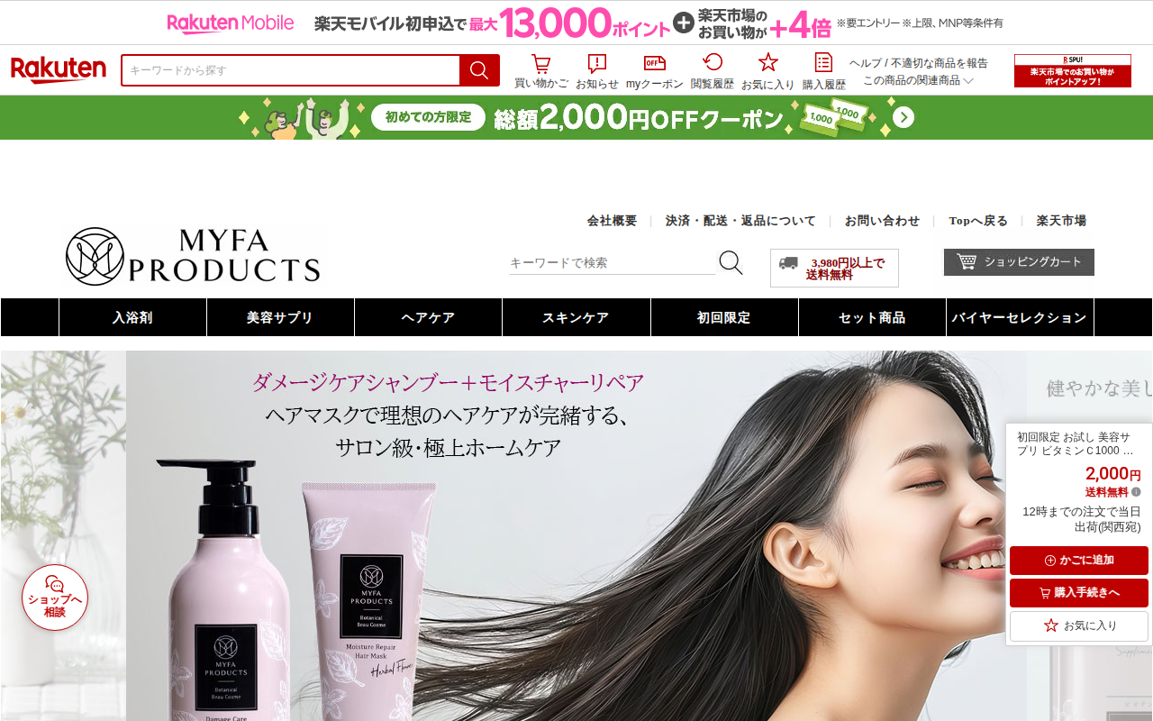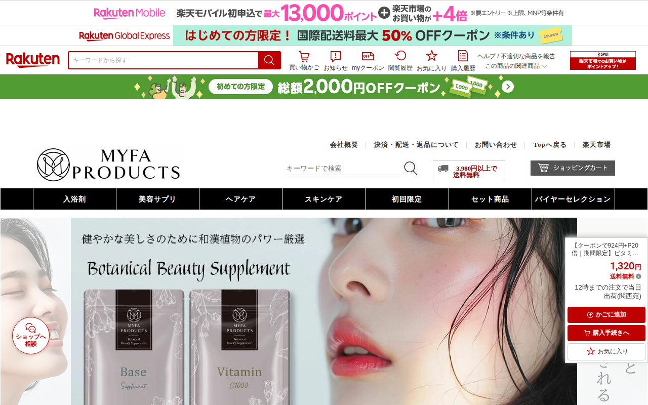 このページは、楽天市場で販売されているマイファプロダクツの美容サプリメント「ベースサプリメント」の商品ページです。初回限定価格2,000円の3袋セット(90日分)で、送料無料です。ハト麦やアズキなど6種類の和漢植物、12...