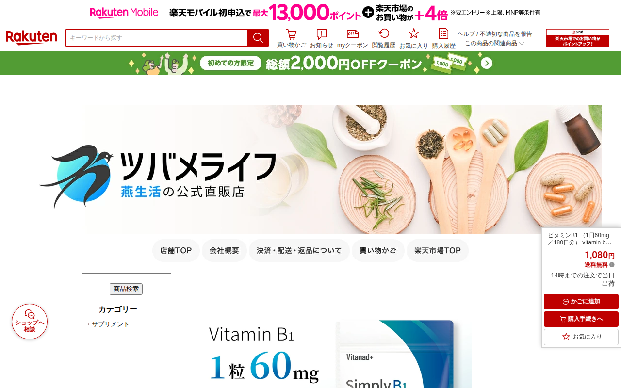 【楽天市場】ビタミンB1 (1日60mg/180日分) vitamin b1 サプリメント 錠剤 タブレット 国産 日本製 Vitanad+(ビタナッド):ツバメライフ 楽天市場店