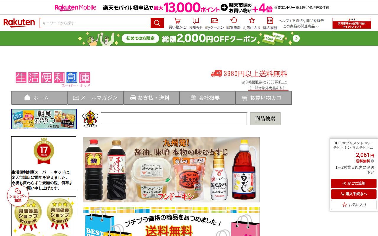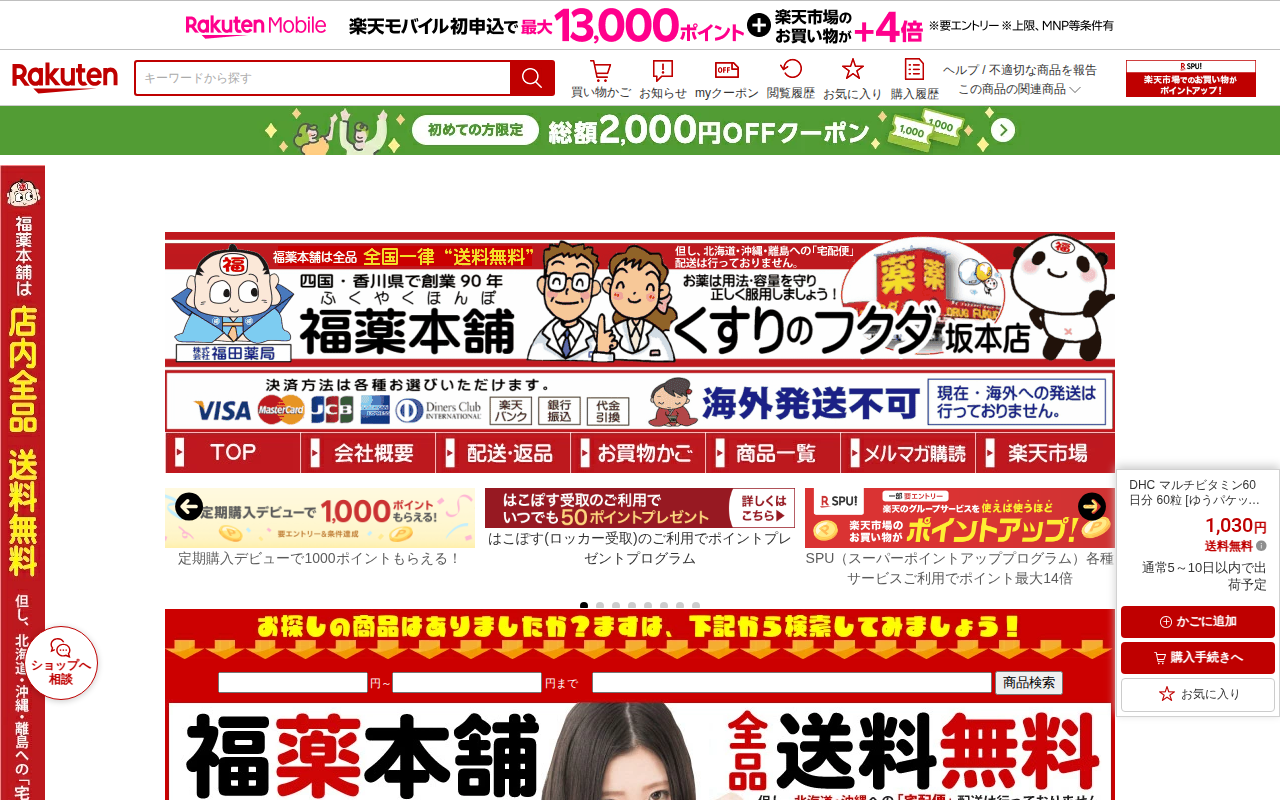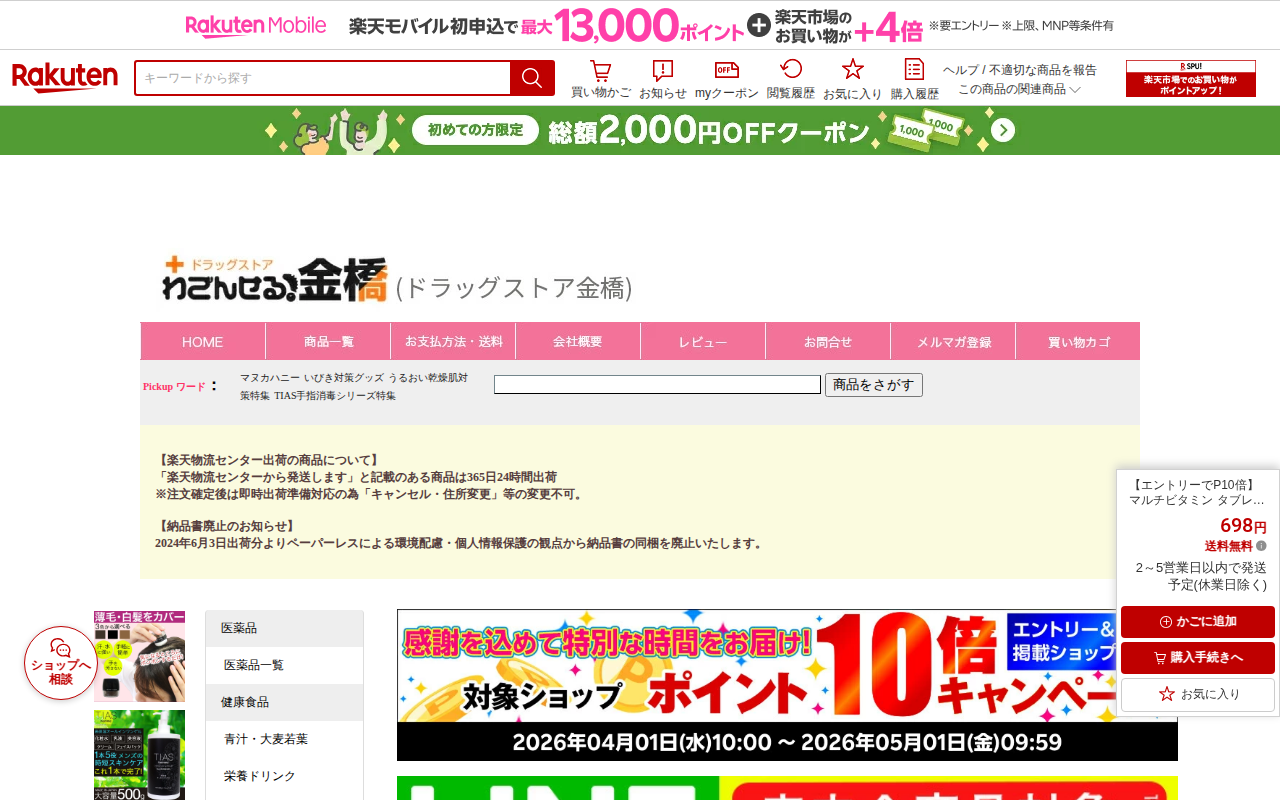 このページは、楽天市場で販売されているDHCのマルチビタミンサプリメントの商品ページです。60粒入り60日分で、1日1粒を目安に摂取します。13種類のビタミン(葉酸、ビタミンC、ビタミンB群、ビタミンD3など)を含む栄養...