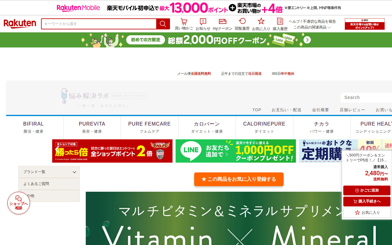 このページは、楽天市場で販売されているピュアビタマルチビタミン&マルチミネラルサプリメントの商品ページです。ビタミン12種とミネラル11種を含む23種の成分をバランスよく配合した栄養機能食品で、国内GMP認定工場で製造さ...
