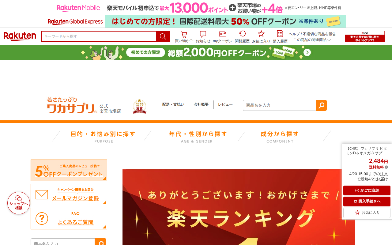 このページはワカサプリの公式楽天市場店で販売されるビタミンD&オメガ-3サプリメントの商品ページです。60粒入りで2,484円、送料無料で、4月20日15時までの注文で最短4月21日に届きます。主成分はノルウェー産サーモ...