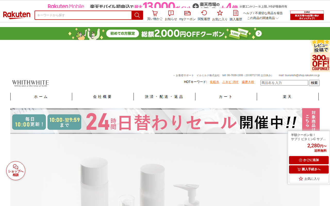 このページは、楽天市場で販売されているWITH WHITEのビタミンCサプリメント商品です。国産SPF豚由来プラセンタ、フィッシュコラーゲンペプチド、ヒアルロン酸などの美容成分を配合した健康補助食品で、1日2粒、60粒入...