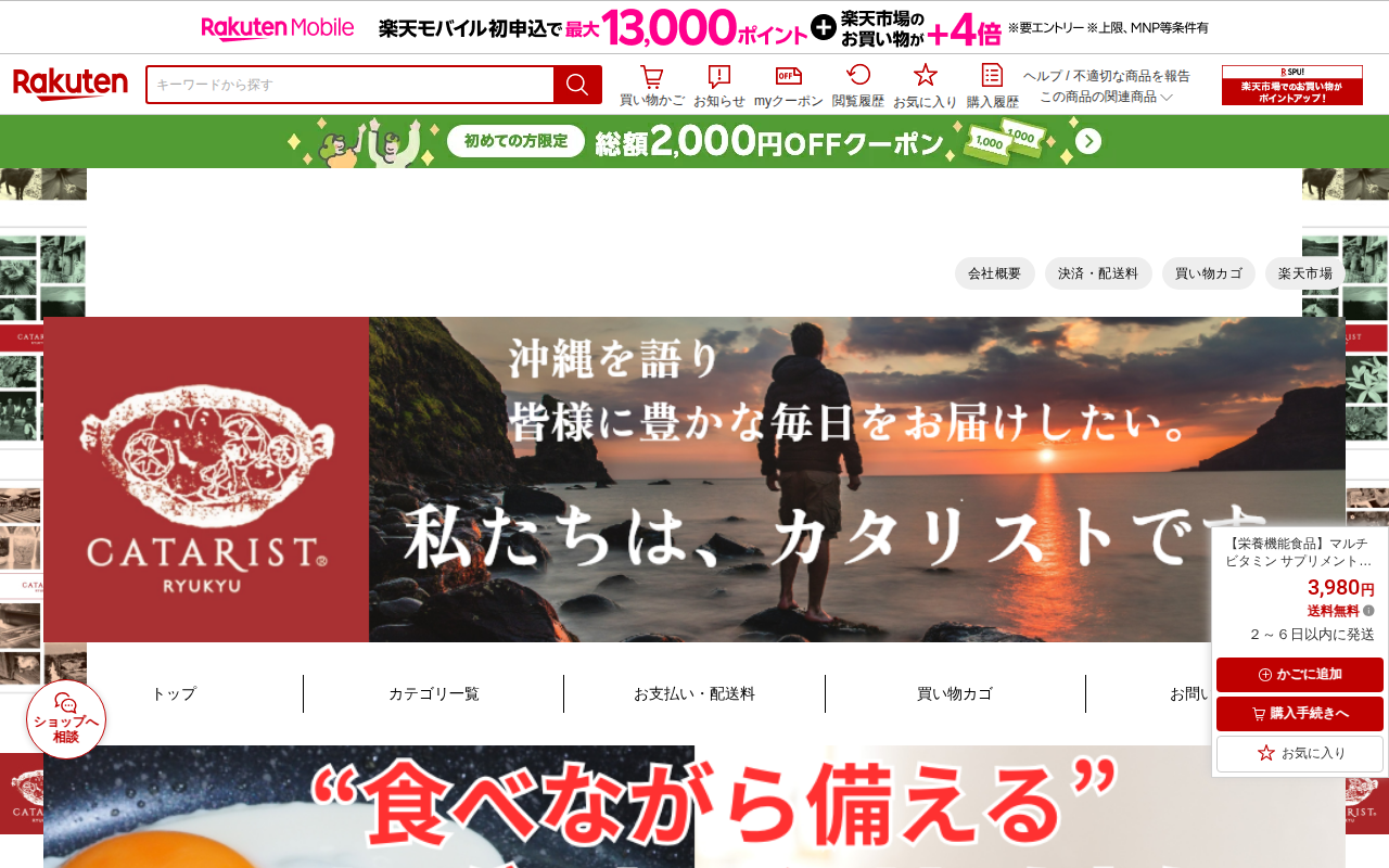 このページは、楽天市場で販売されているマルチビタミンサプリメントの商品ページです。沖縄産スーパーフードを配合した栄養機能食品で、31粒入り、1日1粒で11種類のビタミン(ビタミンA、B1、B2、B6、B12、D、E、ナイ...