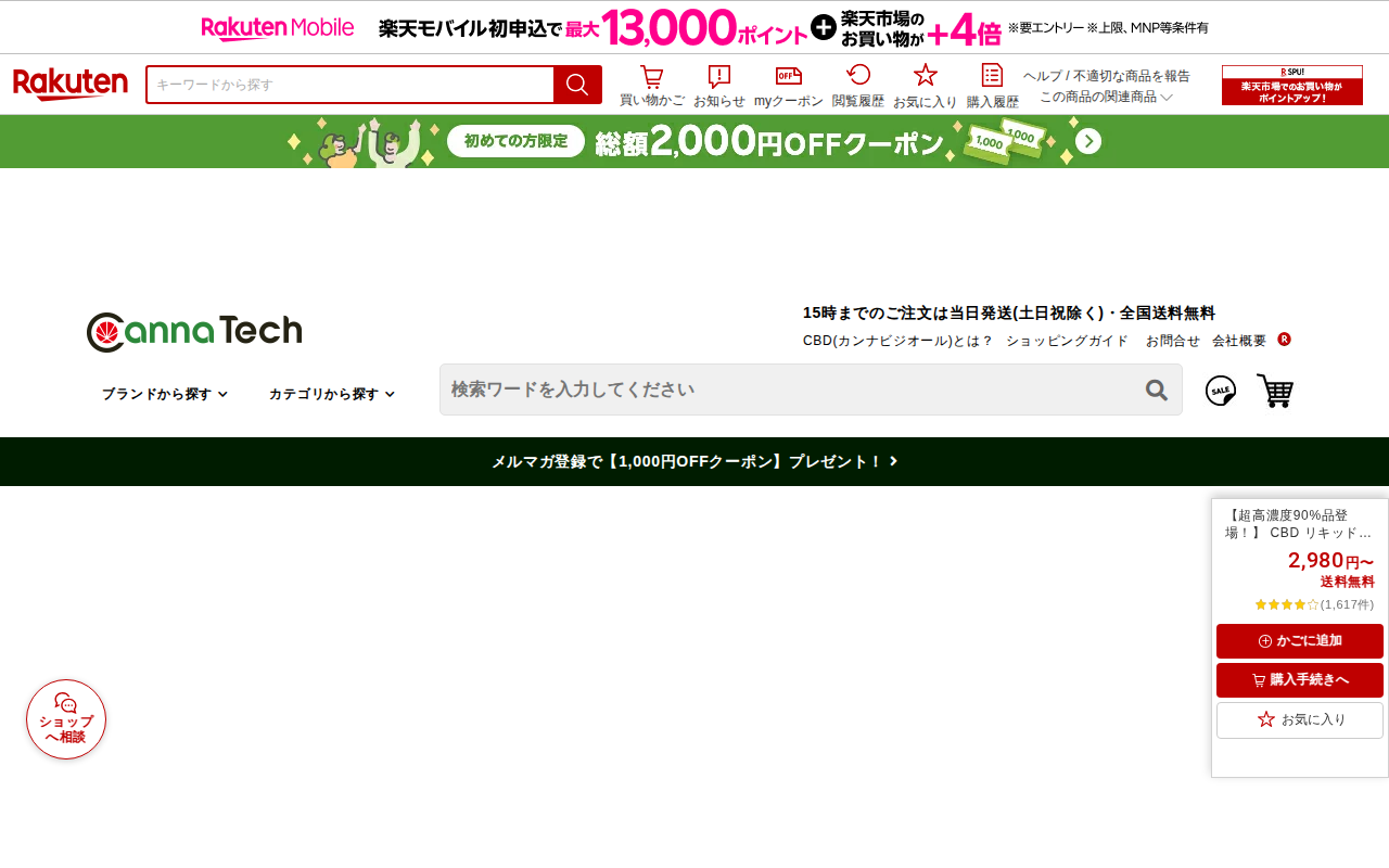 このページは、楽天市場で販売されるCannaTechのCBDベイプリキッド製品の紹介ページです。90%、75%、50%の高濃度CBD製品で、CBN、CBGも配合されています。スターターキットは900mgまたは750mgの...