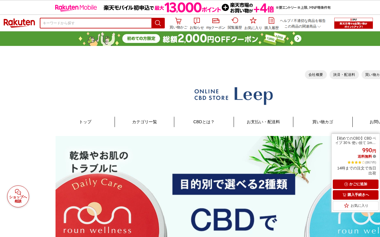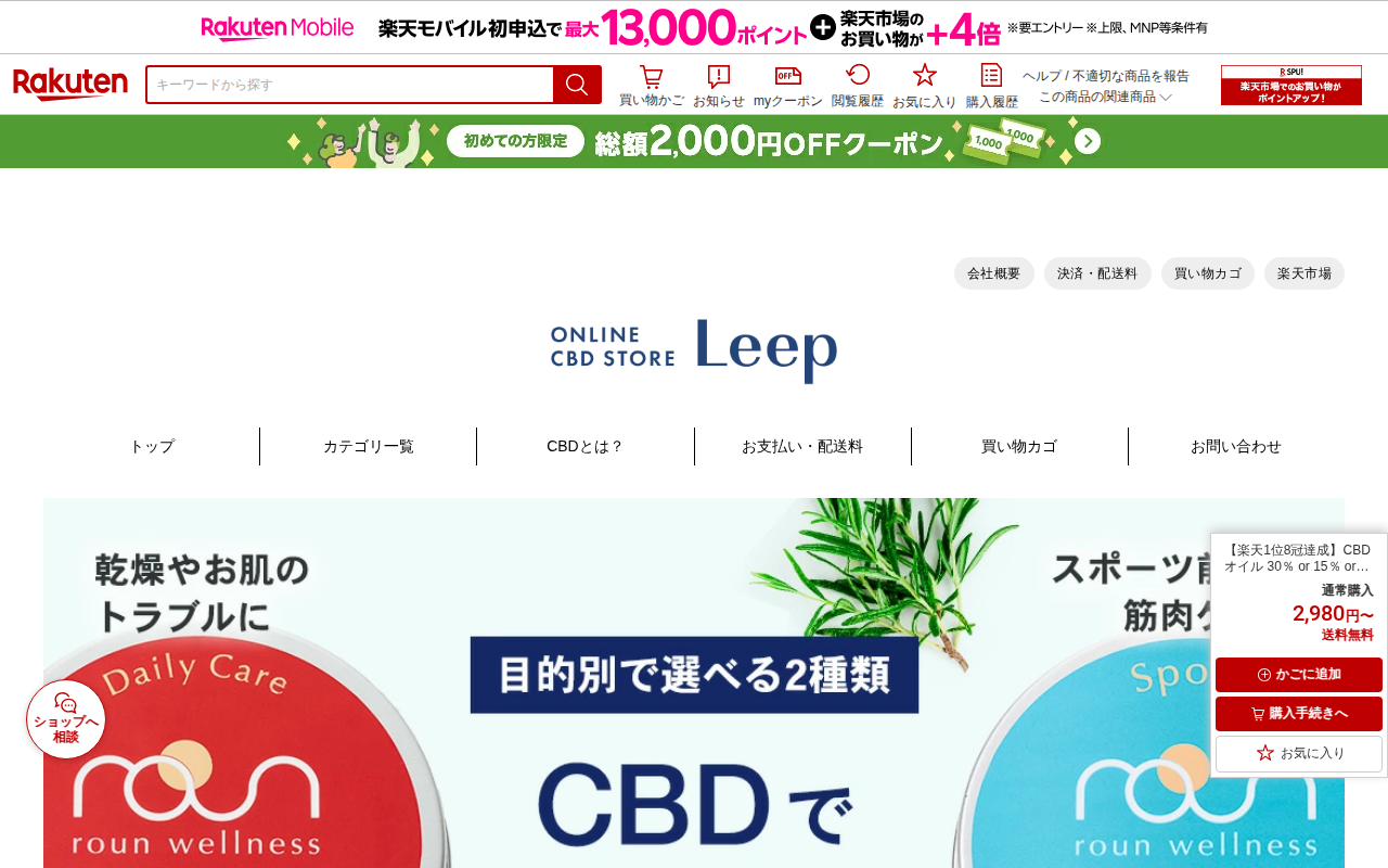 【楽天市場】【楽天1位8冠達成】CBD オイル 30% or 15% or 8% 10ml 高濃度 roun ラウン 3000mg 1500mg 800mg 内容量 10ml CBD oil 国産 GMOフリー サプリ オーガニック 麻由来 日本製 テルペン cbdオイル 高品質 植物由来100% Non-GMO 法改正対応済:Leep 楽天市場店