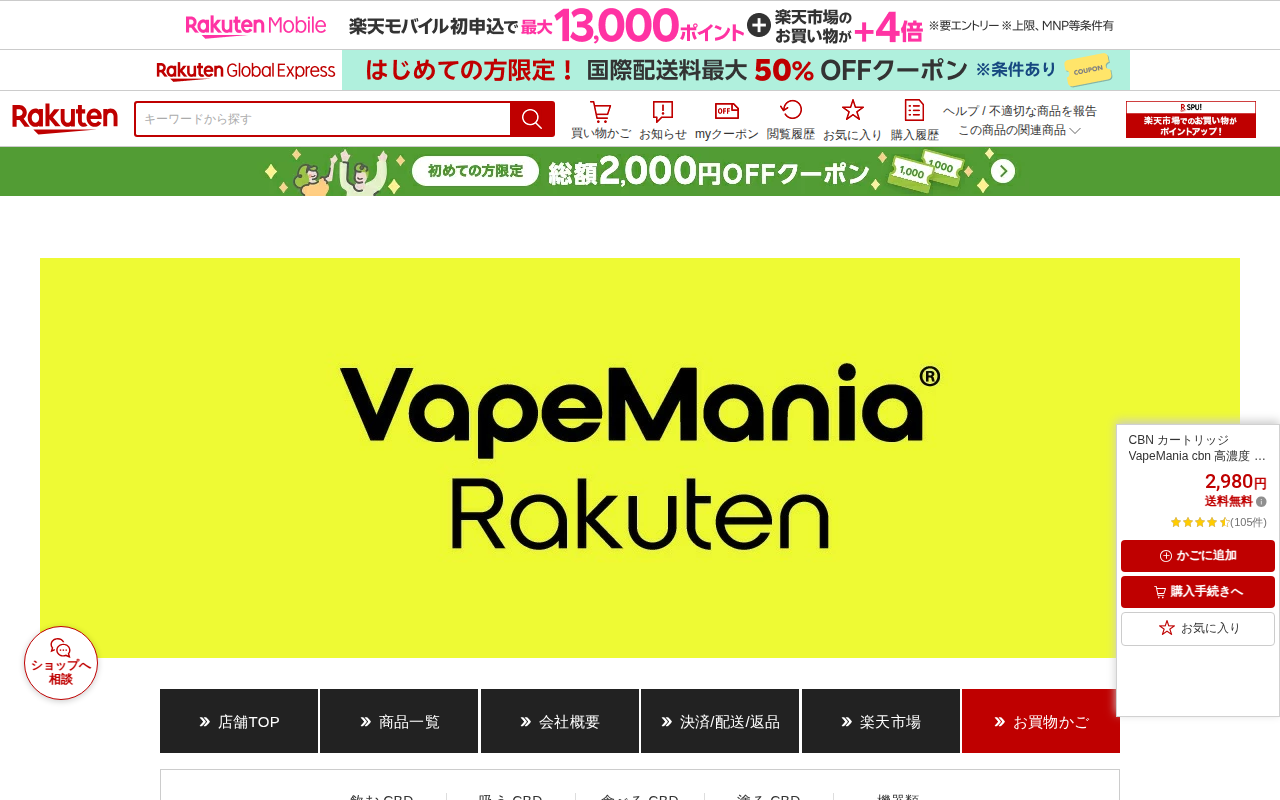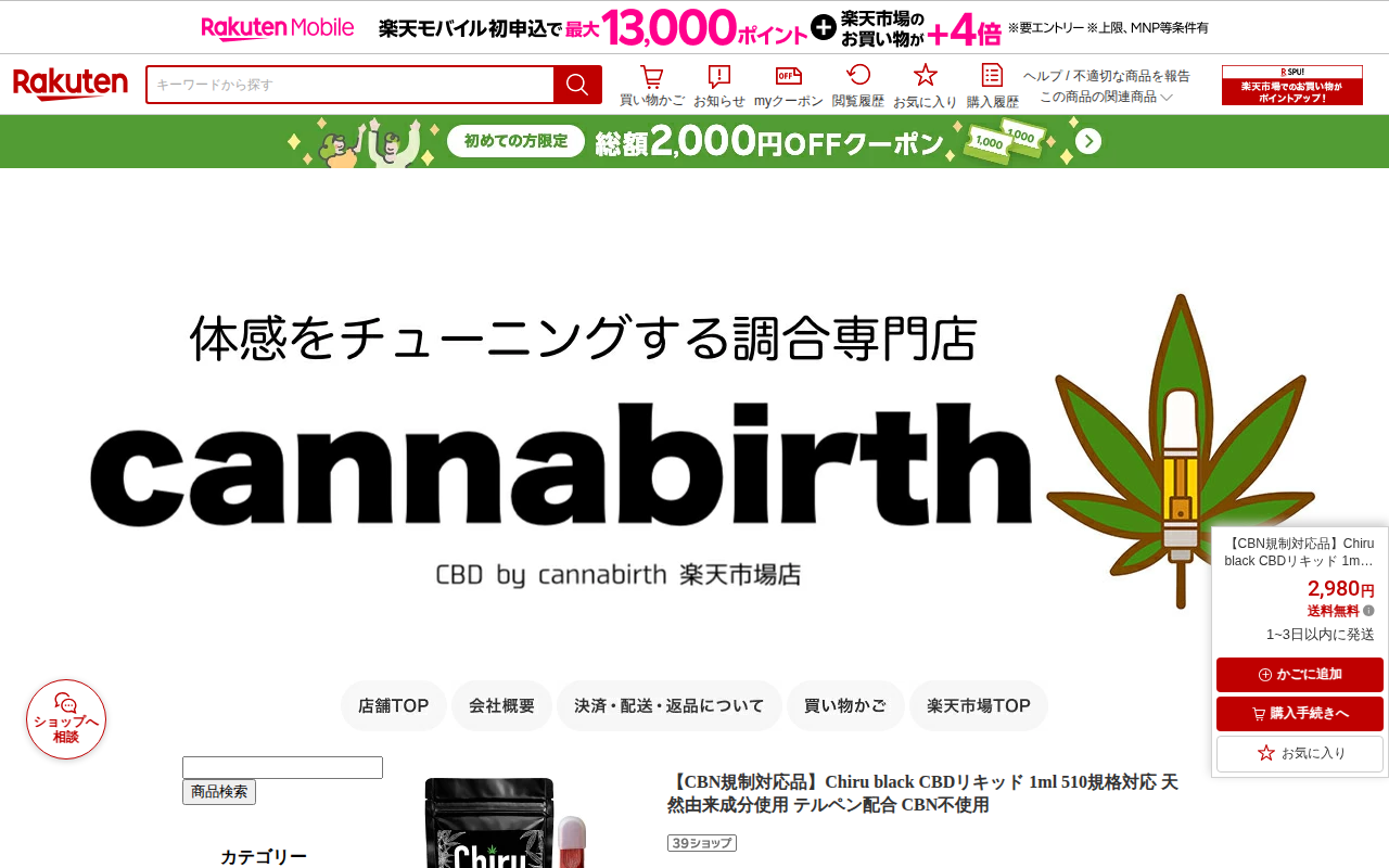 このページは、楽天市場で販売されているcannabirth製「Chiru black CBDリキッド」の商品紹介ページです。1ml、510規格対応のCBDカートリッジで、価格は2,980円(送料無料)。CBN規制対応品と...