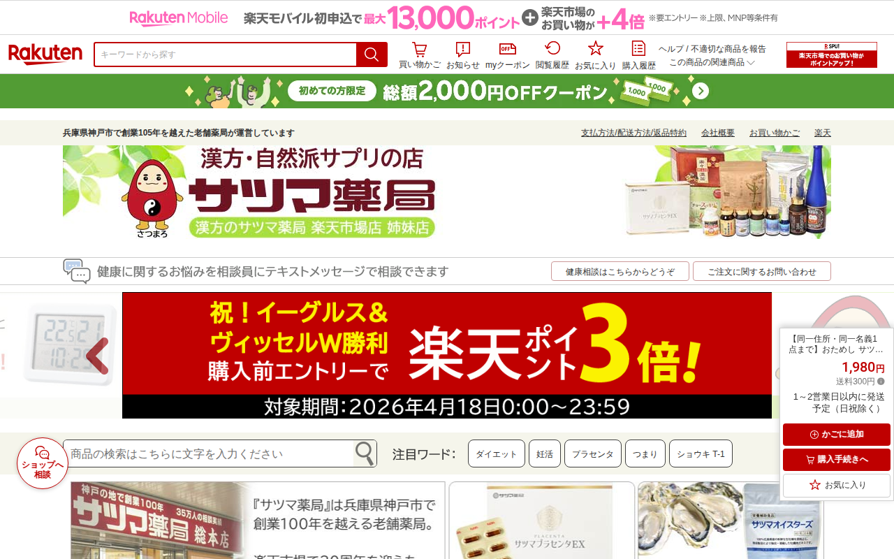 このページは、楽天市場で販売されているサツマ薬局オリジナルのプラセンタサプリメント「サツマ プラセンタ EX」の商品ページです。30カプセル(約10日分)の初回限定お試し商品で、価格は1,980円です。豚プラセンタ、コラ...