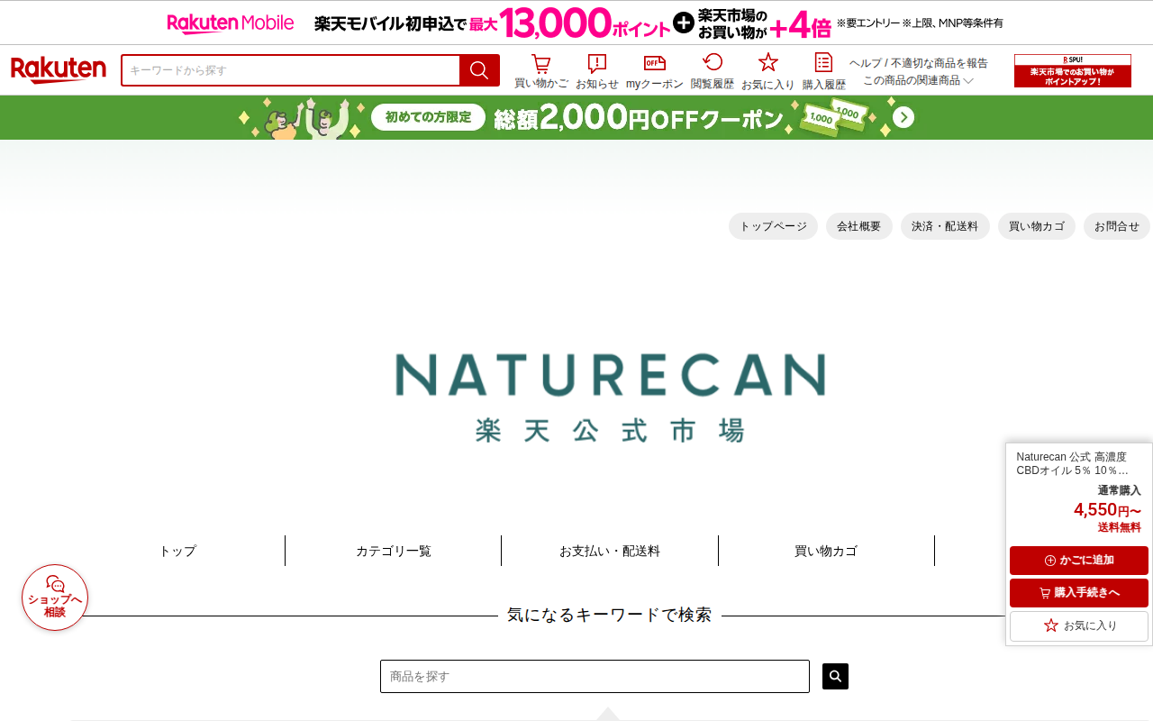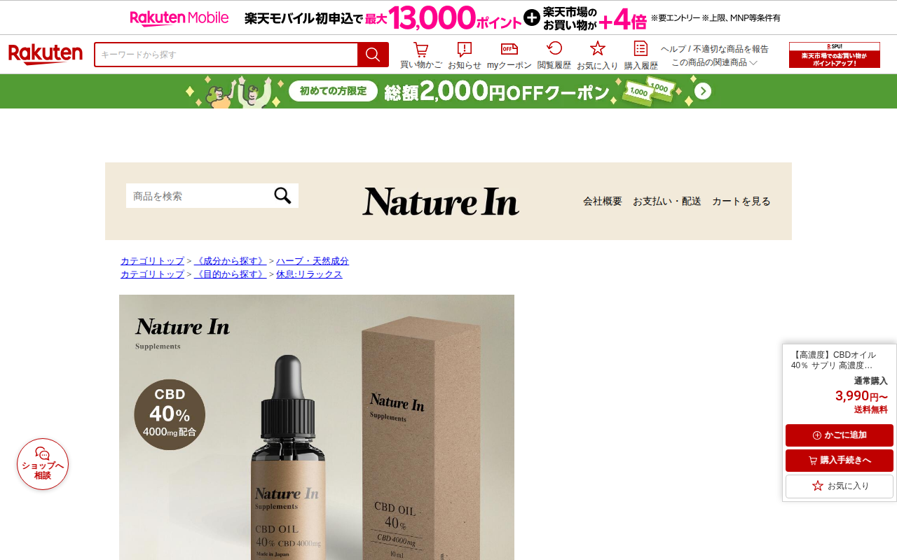 このページは、楽天市場で販売されているNature In製のCBDオイル40%濃度商品の販売ページです。10mlあたりCBD4000mgを配合した高濃度サプリメントで、3,990円から購入可能です。アメリカ産の高濃度CB...