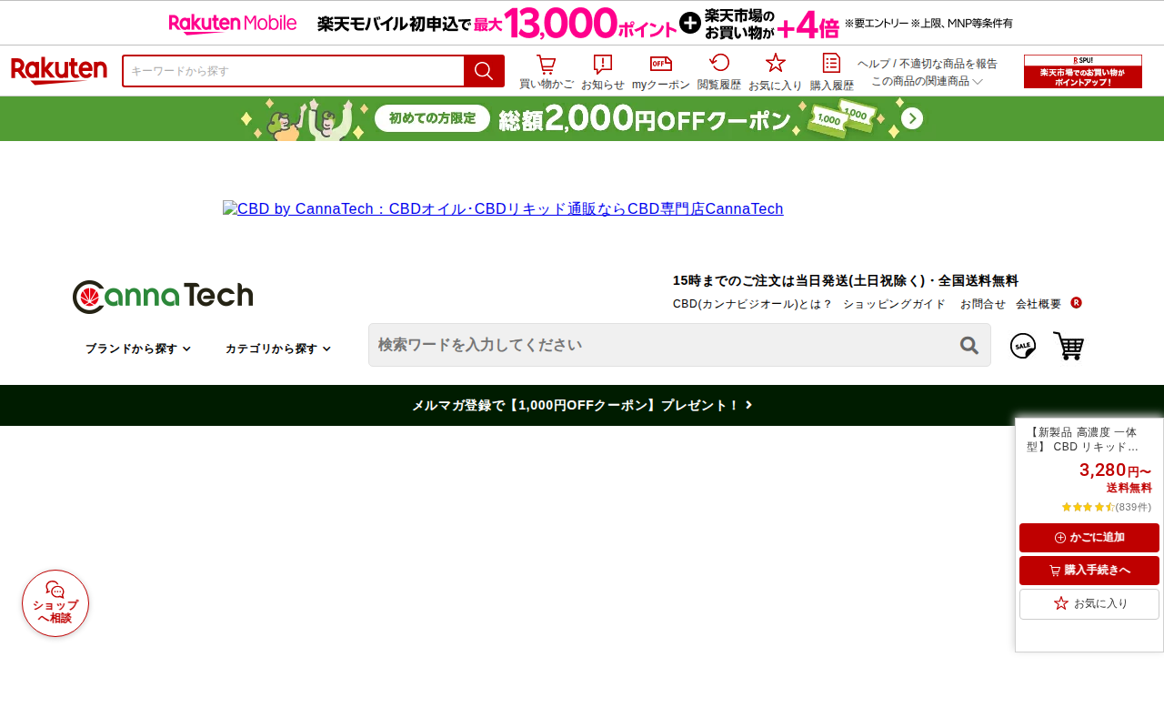 このページは、楽天市場で販売されているCannaTech製のCBDリキッド一体型ベイプペンの商品詳細ページです。87%、75%、50%の3種類の高濃度タイプが3,280円から購入でき、1g(200~300回分)にCBD4...