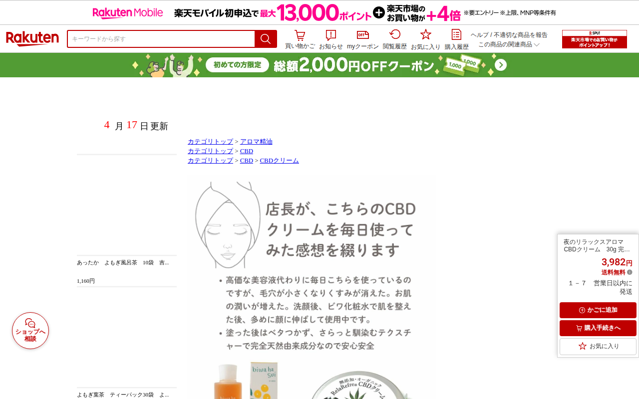 このページは、楽天市場で販売されている「夜のリラックスアロマ CBDクリーム」の商品ページです。30g入りで価格は3,982円(送料無料)。完全無添加のオーガニック成分のみで日本製。CBD含有量0.5%でTHCフリー。ゼ...