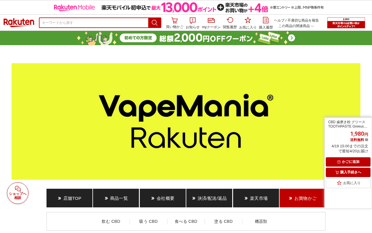 このページは、Greeus(グリース)というブランドのCBD配合歯磨き粉(55g、CBD100mg)を販売する楽天市場の商品ページです。価格は1,980円で送料無料です。ヘンプ由来のCBD(カンナビジオール)と国産無添加...