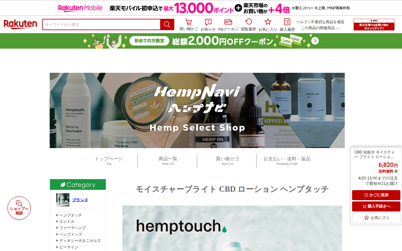 このページは、スロベニア発祥のCBDブランド「ヘンプタッチ」が開発したオーガニックスキンケア化粧水「モイスチャーブライトCBDローション」を紹介しています。ヘンプシードオイル、CBDオイル、ヒアルロン酸などを含み、乾燥肌...