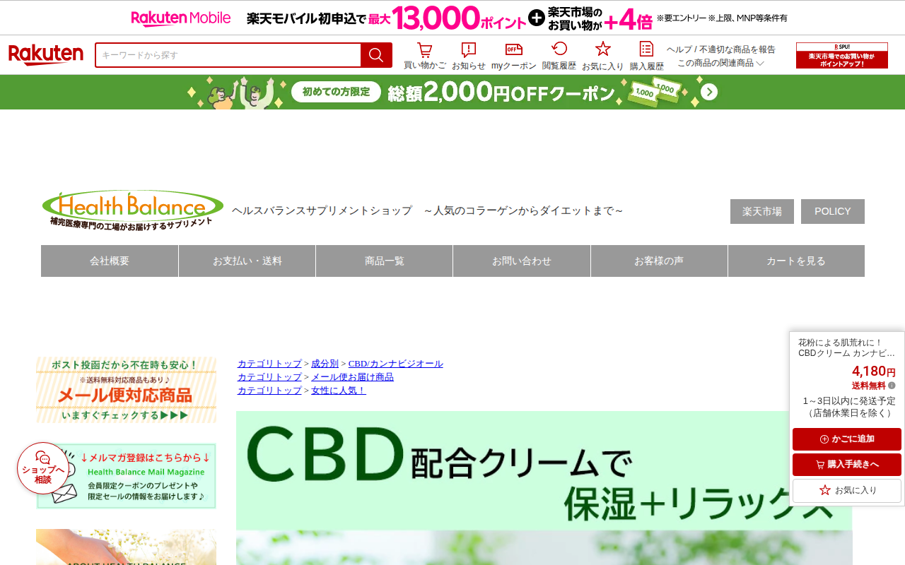 このページは、楽天市場で販売されているCBDクリーム「RelaRefre」の商品ページです。花粉やマスク荒れによる敏感肌対策用で、カンナビジオール(CBD)配合の無添加・オーガニッククリーム。4,180円(送料無料)。T...
