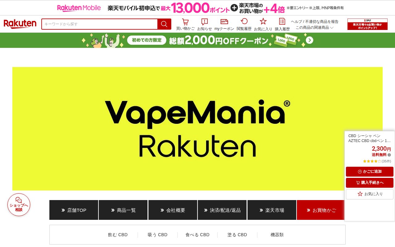 このページはAZTEC CBDの使い捨てCBDペン(シーシャペン)を販売する楽天市場の商品ページです。1ml容量でCBD25%(250mg)配合、約300回吸引可能な高濃度製品です。オーガニック無農薬の原料から製造された...