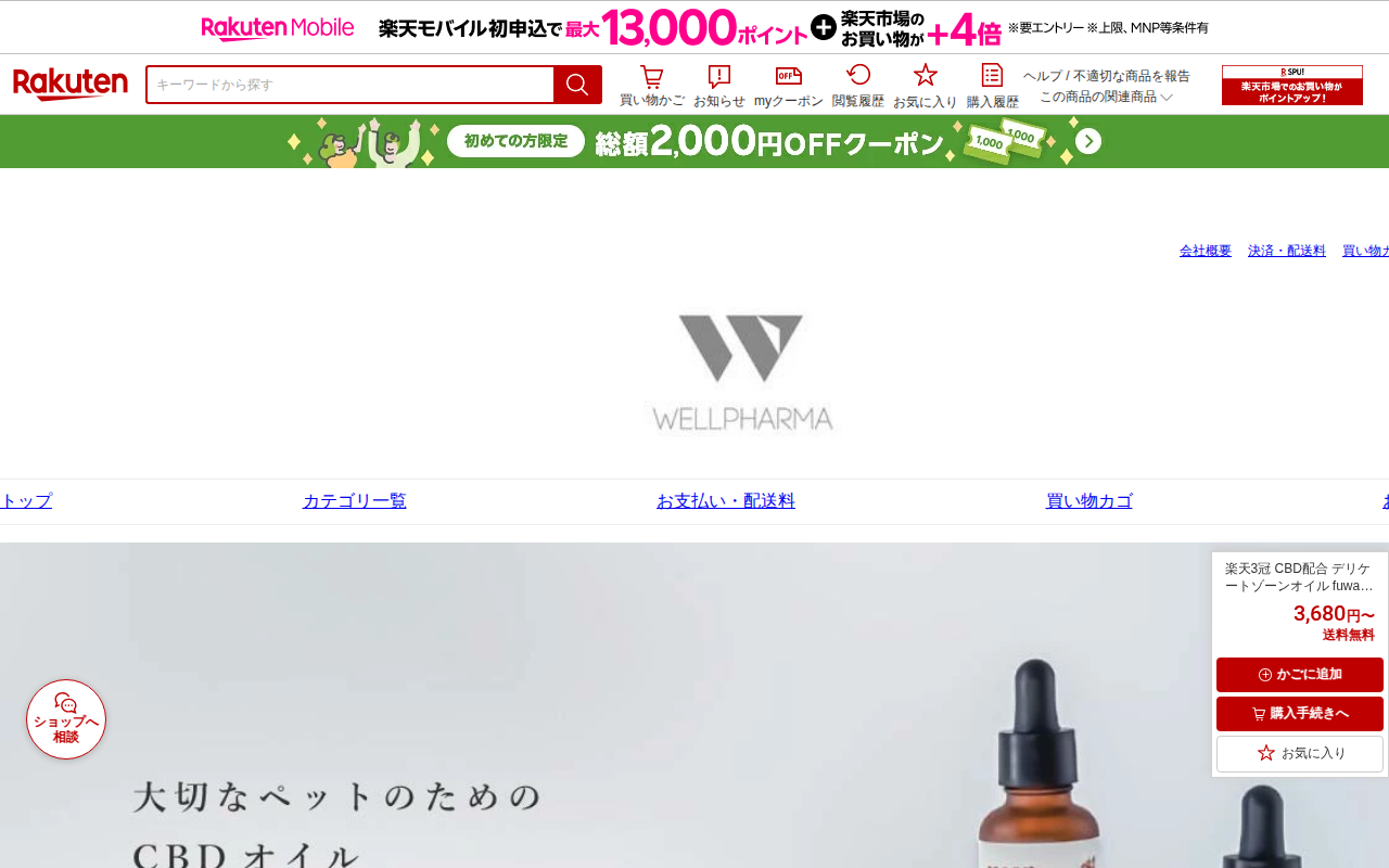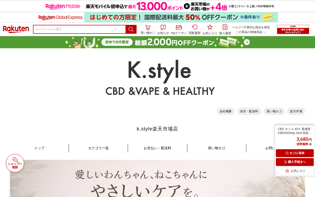 このページは、楽天市場で販売されている高濃度CBDオイル「terpender」の商品ページです。40%濃度のCBD4000mg配合、10ml入りで3,680円。国産・オーガニック品質で、THCフリー、初心者向けです。OG...