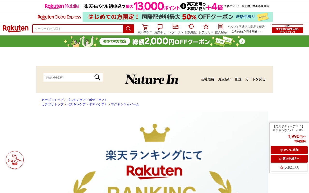 このページは、楽天市場で販売されているNature In製のマグネシウムバームの商品紹介ページです。高濃度のマグネシウムを肌に優しい植物オイルで配合したバームで、肩・首・こめかみのケアに適しています。冷感処方でひんやりと...