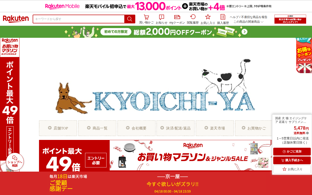 このページは、楽天市場で販売されている国産ペット用サプリメント「犬潤」の商品ページです。100g(約30日分)で5,478円の商品で、送料無料です。コラーゲンペプチドを低分子化したトリペプチド配合で、脂質・糖質ゼロ。体重...