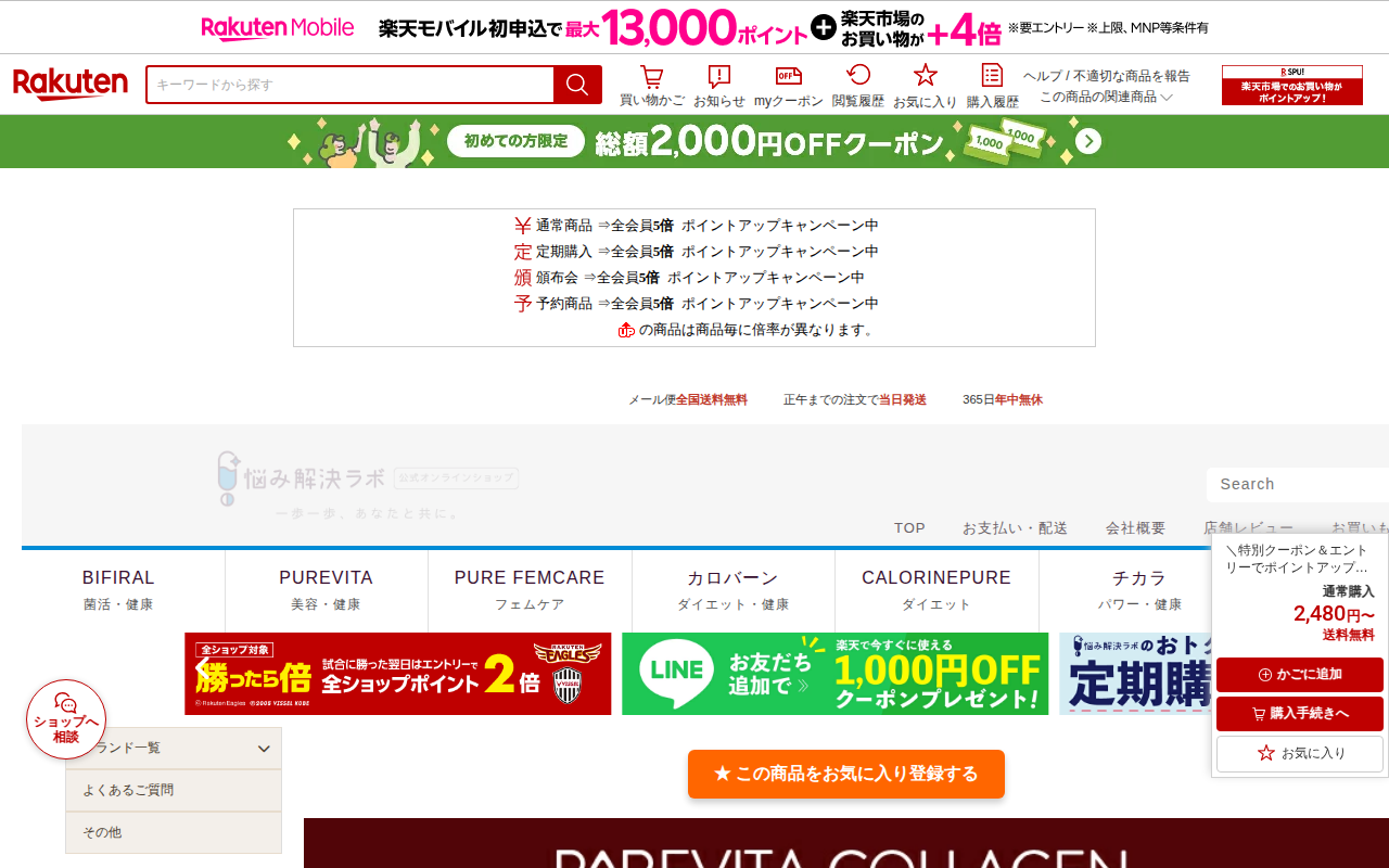 このページは、楽天市場で販売されている「ピュアビタコラーゲン」という美容サプリメントの商品紹介ページです。3種類の低分子コラーゲンを合計18,000mg配合し、プラセンタ、ヒアルロン酸、セラミド、プロテオグリカンなど19...