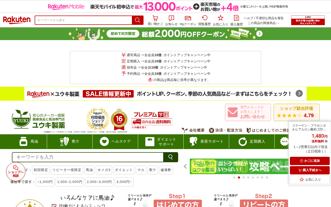 このページは、楽天市場で販売されているユウキ製薬のコラーゲン・プラセンタ&ヒアルロン酸粒サプリメントの商品ページです。220粒入り、約27日分で1,480円、送料無料です。コラーゲン、プラセンタ、ヒアルロン酸という美容成...
