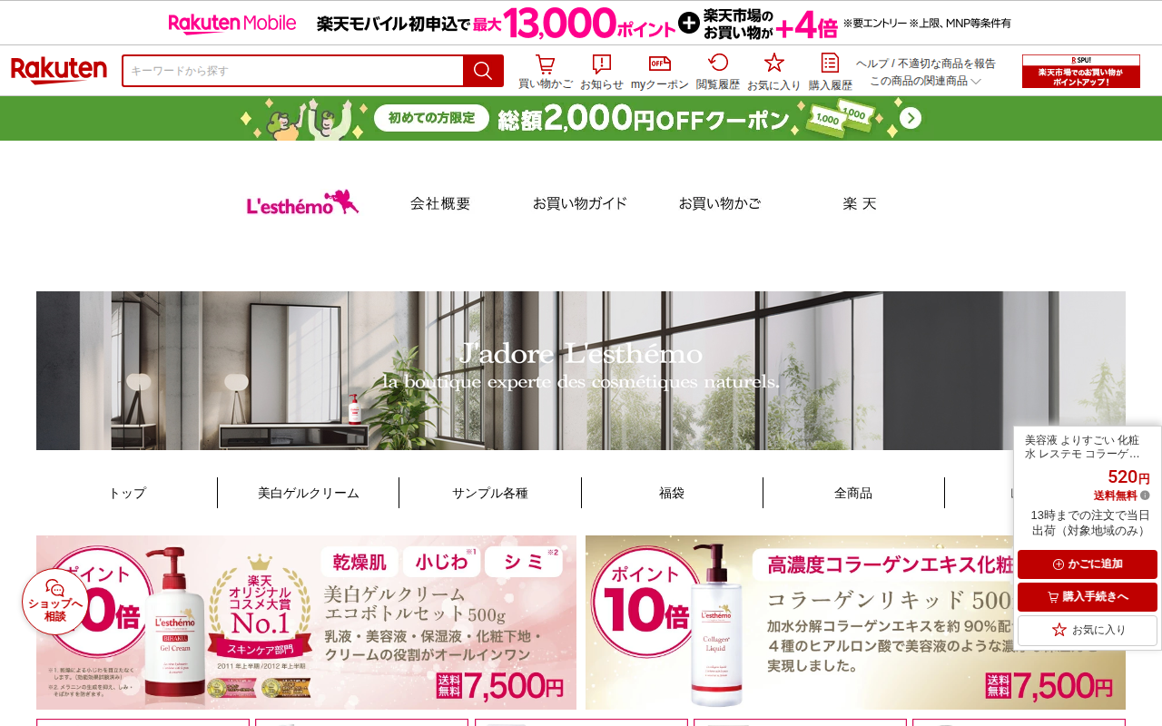 このページは、楽天市場で販売されているレステモのコラーゲンリキッド(16ml)の商品ページです。520円で送料無料、加水分解コラーゲンエキスを約90%配合した化粧水で、水を一滴も使わない処方が特徴です。朝晩の洗顔後に使用...