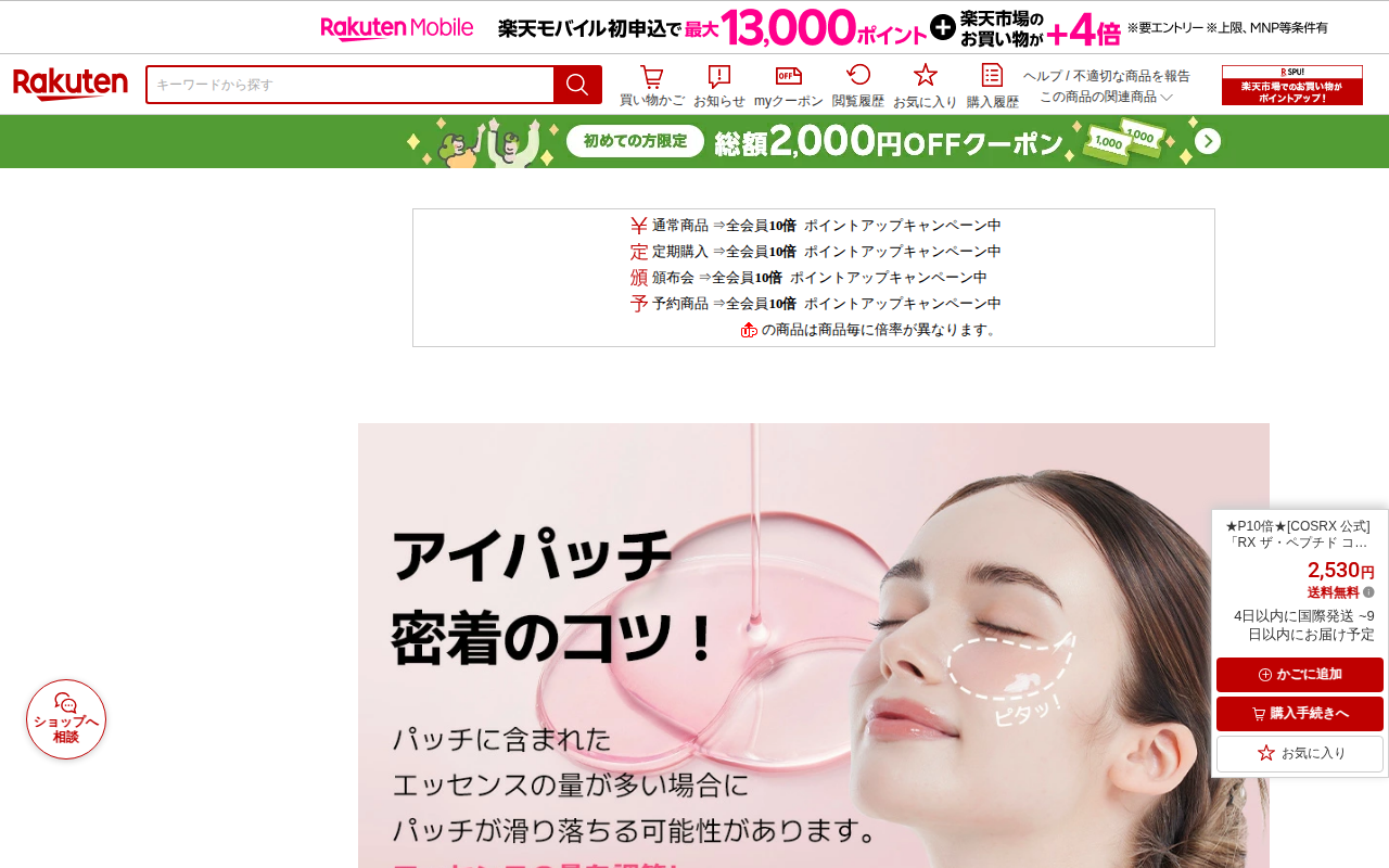 このページはCOSRX公式の韓国コスメ商品「RXザ・ペプチドコラーゲンハイドロゲルアイパッチ(60枚)」の楽天市場販売ページです。目元ケアや目元のくすみ予防、栄養補給、弾力ハリケアを目的とした製品で、価格は2,530円(...