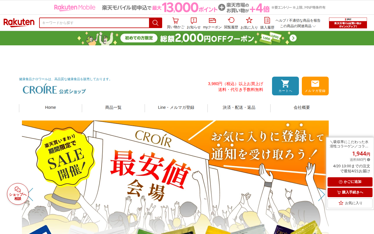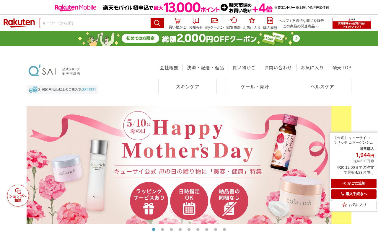 このページはキューサイのコラリッチコラーゲンショットを販売する楽天市場のページです。1箱50ml×10本入りで、1,944円(送料500円)の美容ドリンクです。フィッシュコラーゲンペプチド5,000mgを配合し、ローヤル...