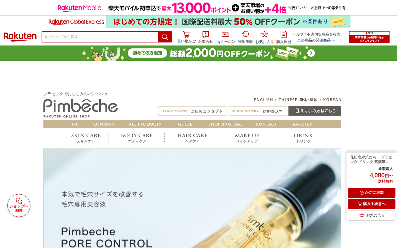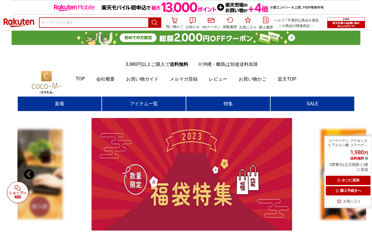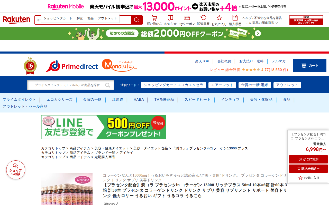 このページは、楽天市場で販売されている「潤コラ プラセンタin コラーゲン 13000 リッチプラス」という美容ドリンクの商品紹介ページです。1本50mlあたりコラーゲン13,000mgを配合した低カロリー飲料で、プラセ...